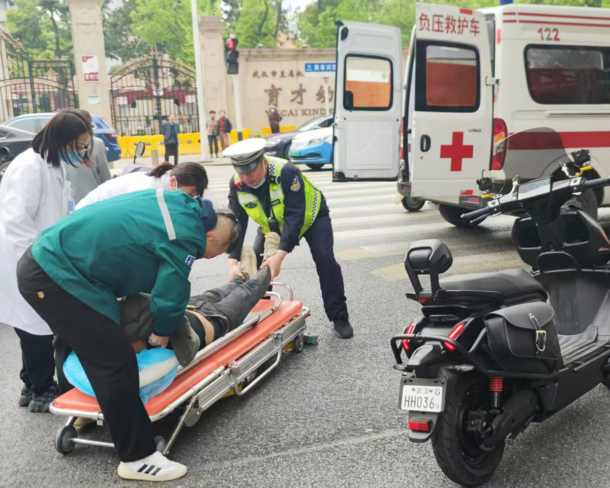 4月7日下午5时20分许,正值晚高峰车流密集时段,武汉市公安局江岸区分局交通管理大队八中队辅警吴伟民在路面执勤时,发现一名驾驶电动车的男子突然倒地、意识不清,情况万分危急。