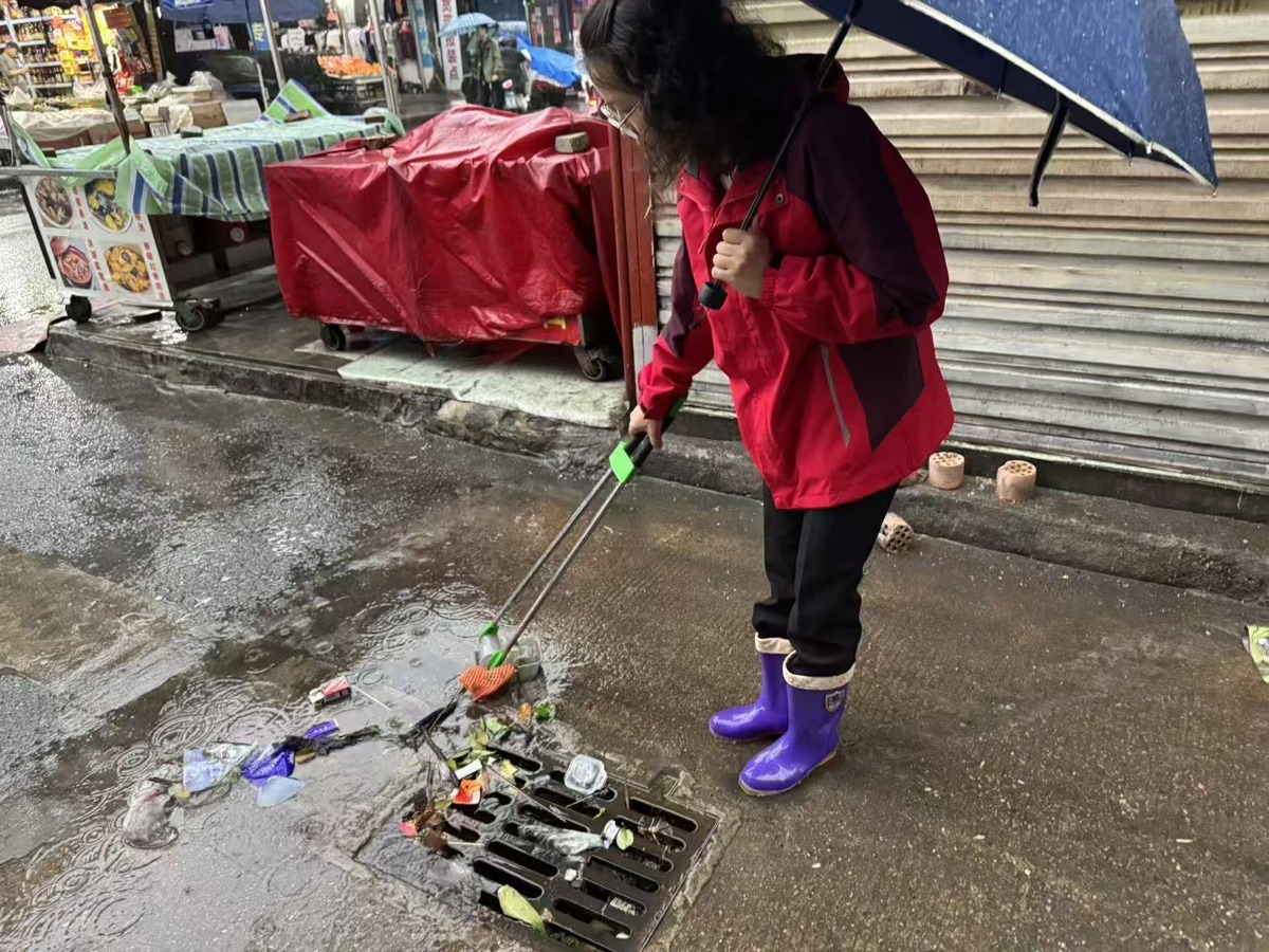 当日凌晨,社区工作人员、志愿者便第一时间分批次出动,对团结村片区主次干道、背街小巷、农贸市场周边、村湾出入口等重点区域开展拉网式排查。大家手持垃圾夹、耙子等工具,逐一对堵塞的排水井盖进行清掏,确保排水口畅通。