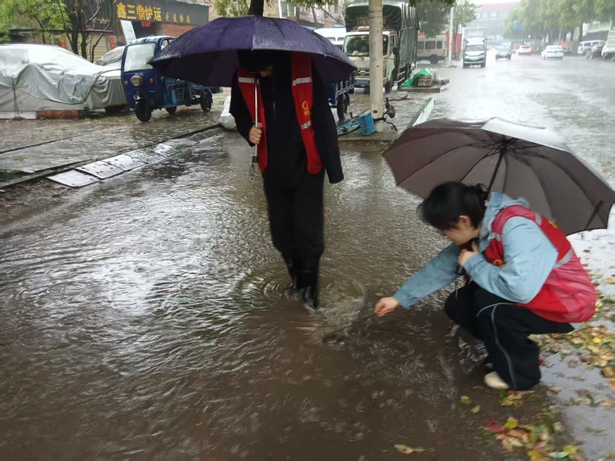在团结村中心街入口,志愿者蹲在积水中,徒手清理被塑料袋、菜叶堵塞的井盖,避免积水影响居民买菜通行;在村内背街小巷,党员志愿者逐户排查排水情况,对堵塞的排水口逐一疏通,确保雨水顺利下排。