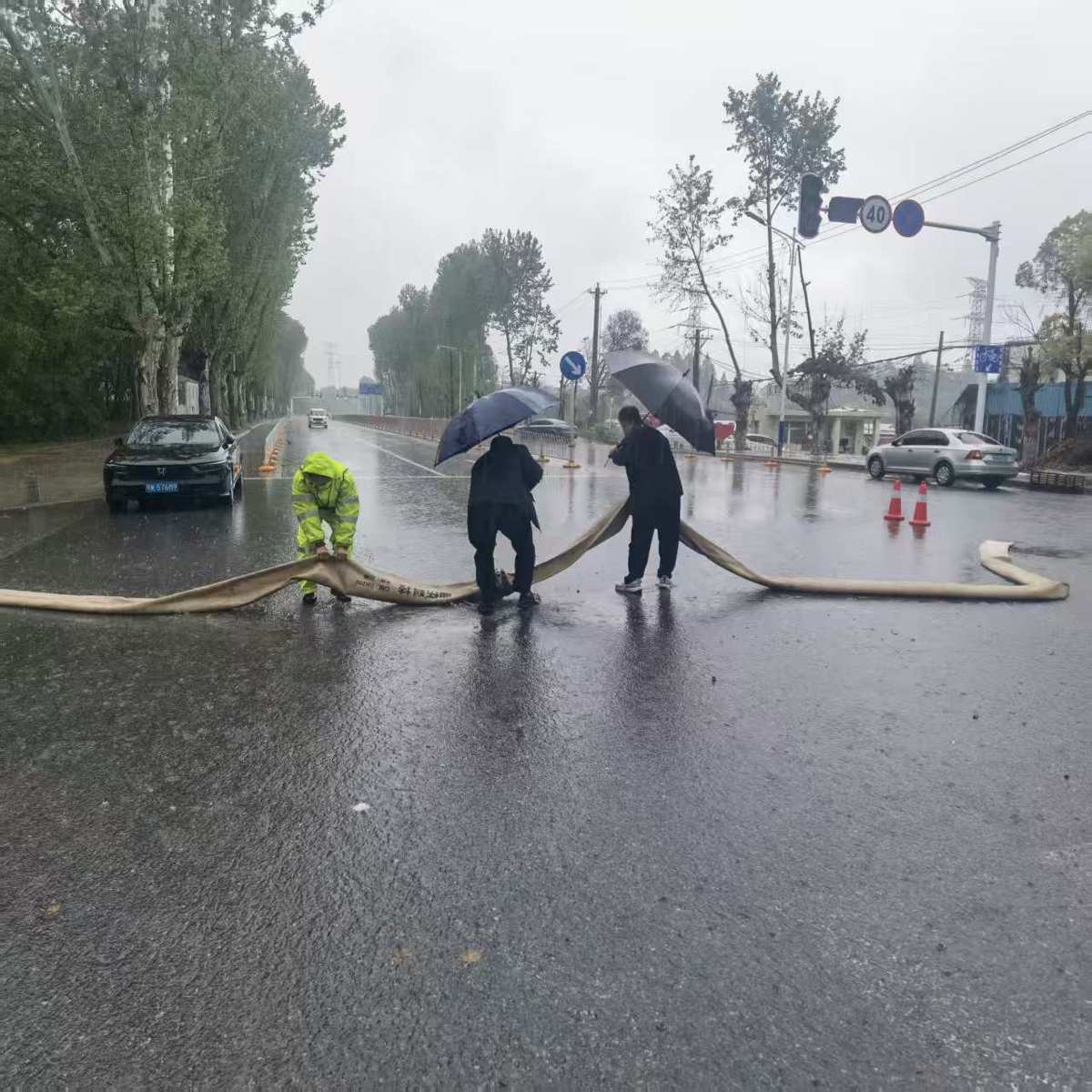武湖街道综合执法中心闻“汛”即动,第一时间启动应急响应,组织执法队员火速赶赴积水现场。队员们冒雨在积水路段设置警示锥桶、划定安全区域,全程现场疏导过往车辆绕行,全力防范交通安全事故发生。同时,中心主动联动水务单位,协调专业抽排设备与作业人员到场,快速架设抽排水管线,对积水路段开展强力抽排作业。