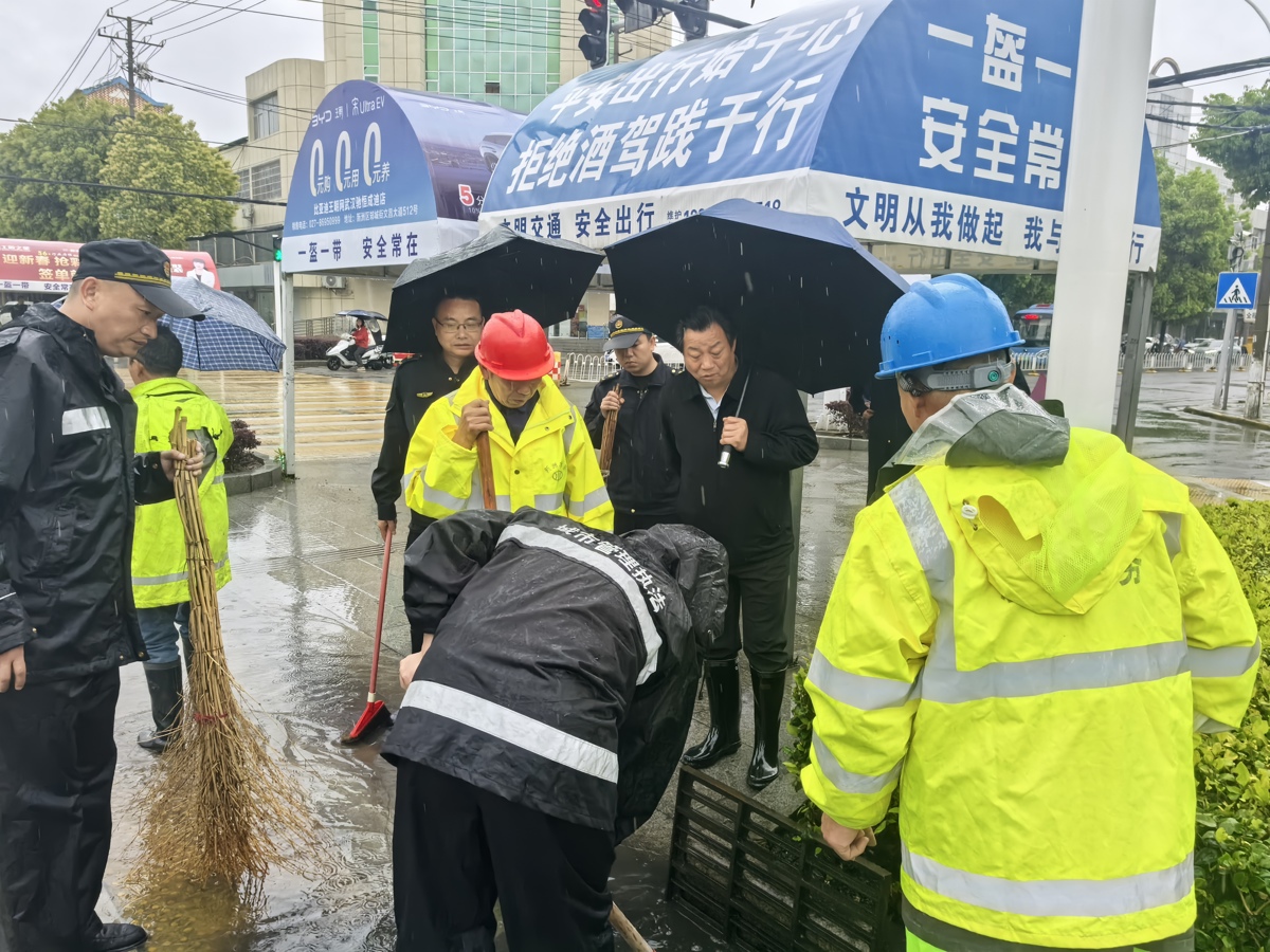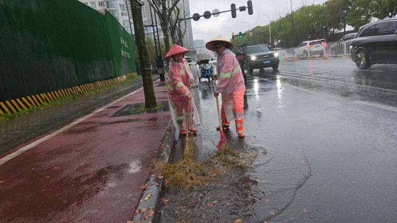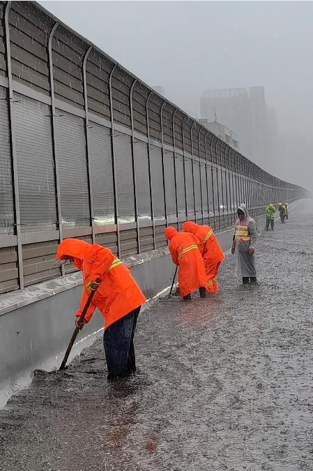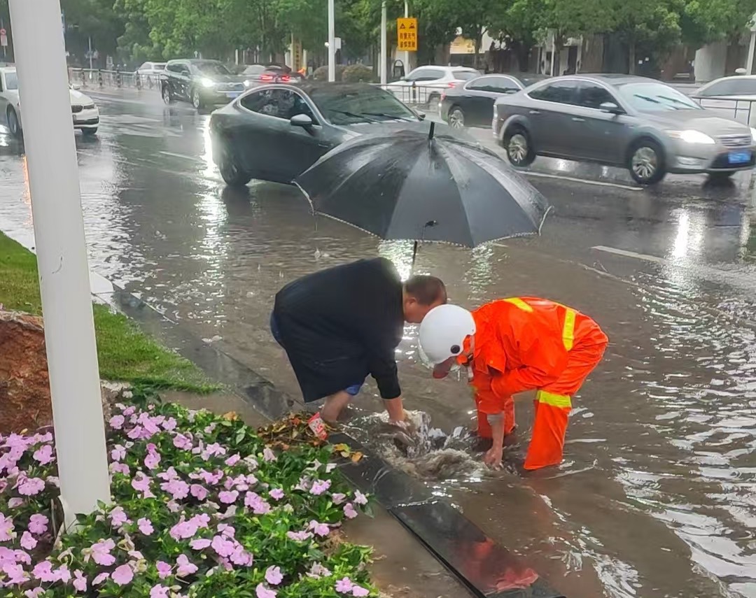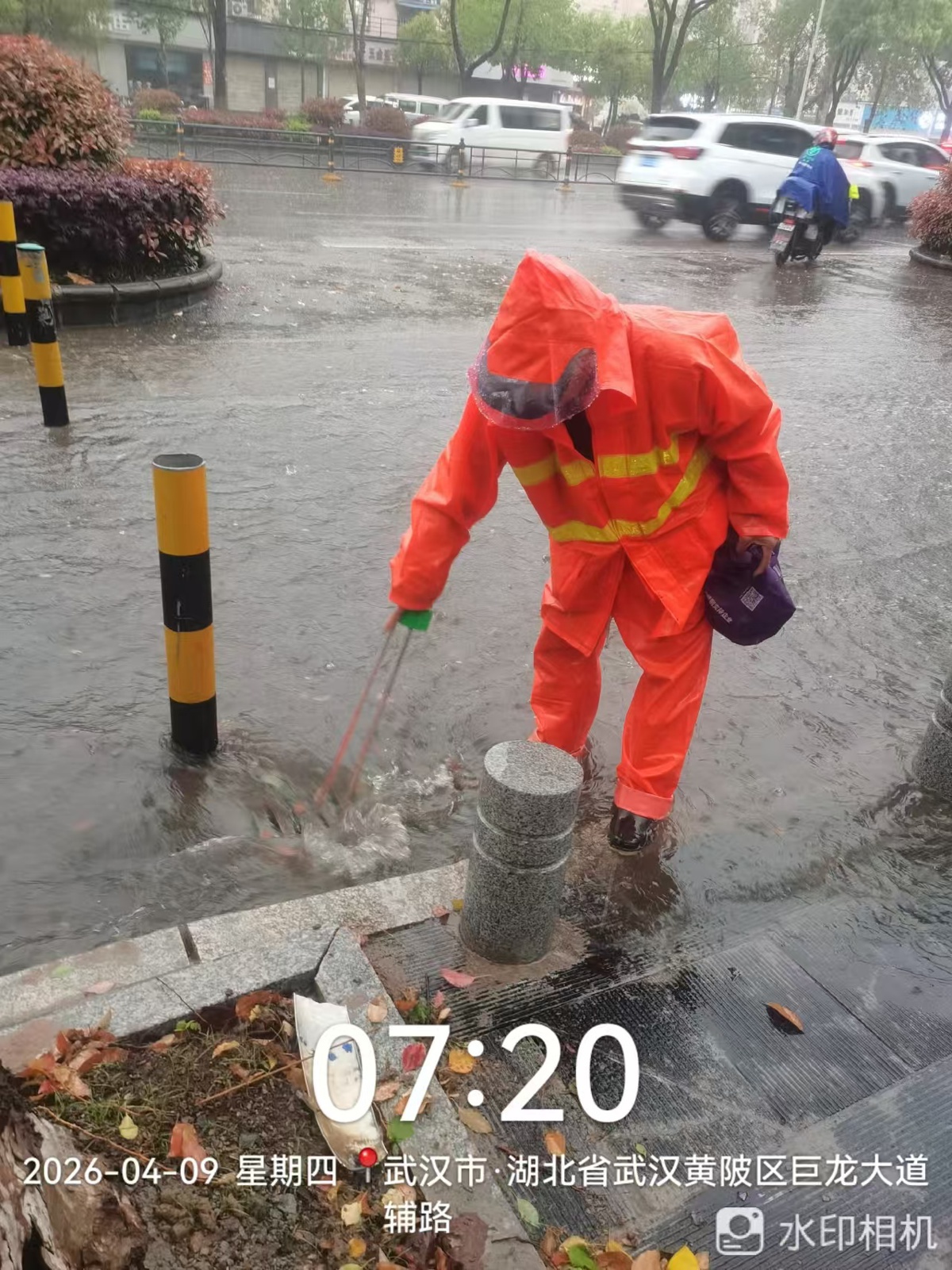 江汉区采取“定点值守+动态巡查”模式,980名环卫工人雨中坚守,对132个短时积水点位实施“人工清掏+机械疏通”快速处置,累计疏通排水口320处。