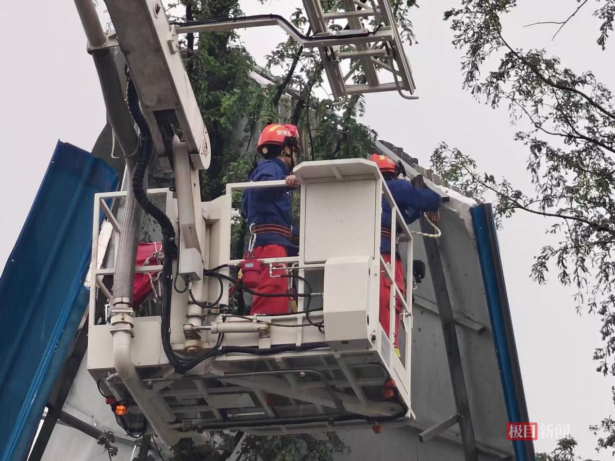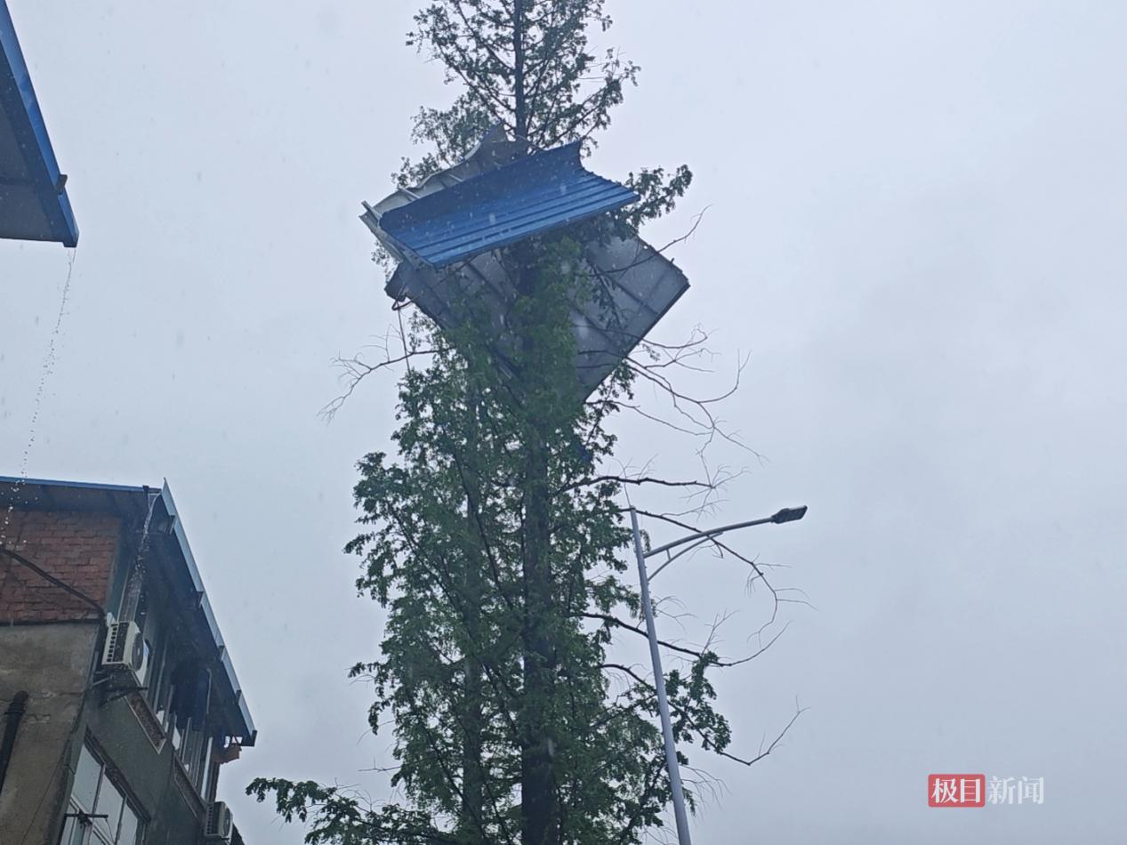 9时53分,东西湖区走马岭街一居民楼顶的整块遮雨棚被大风刮落,悬挂在路边的树干上,摇摇欲坠。走马岭消防救援站立刻出动1辆消防车、6名消防员赶赴现场处置。