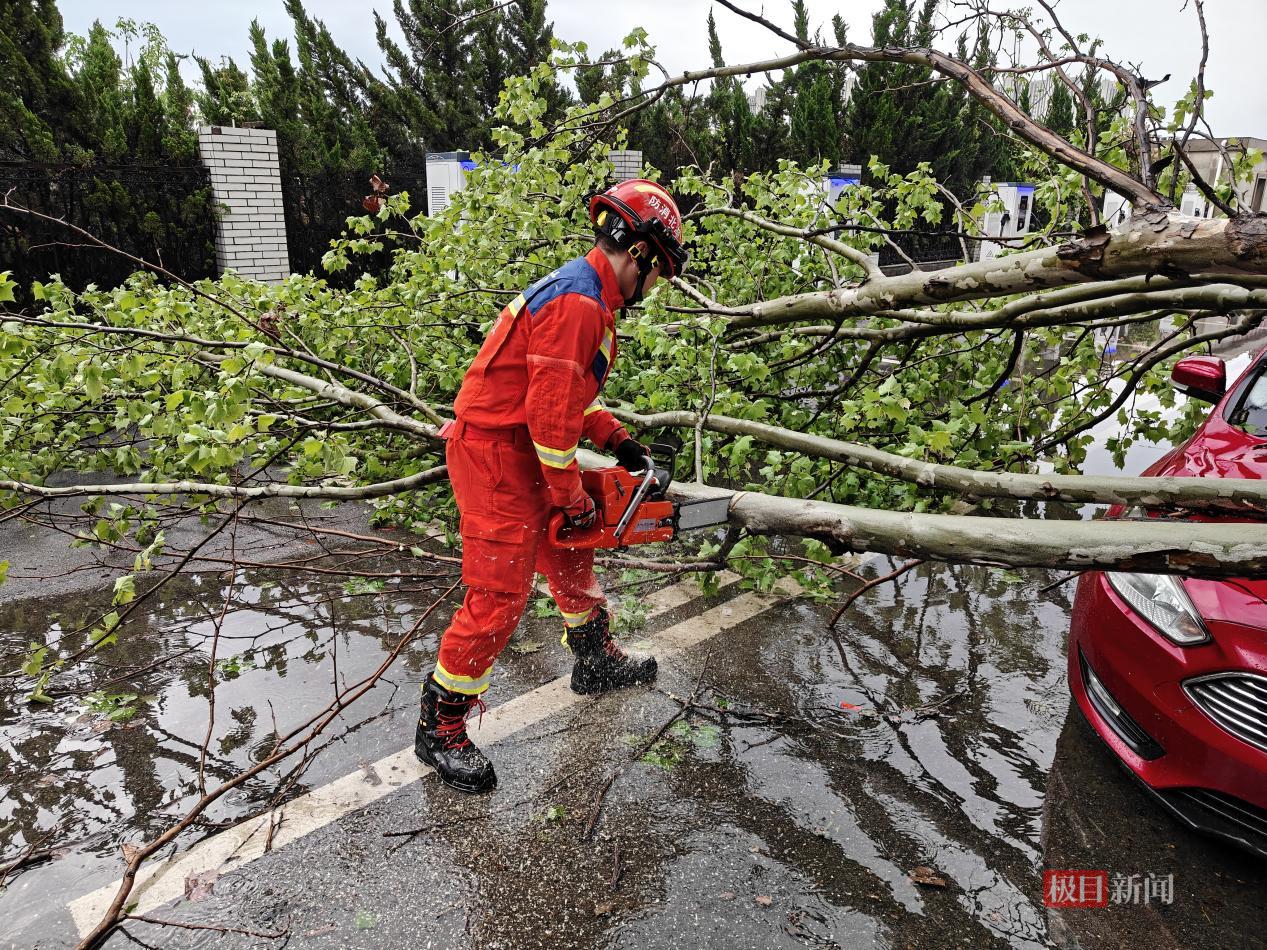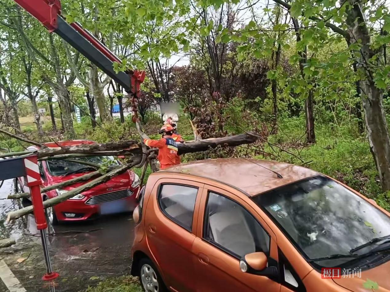 9时08分,江夏区五里界梁子湖大道附近,路边一棵直径约40公分的大树被拦腰折断,砸中停靠在路边的一辆轿车。五里界消防救援站立刻出动1辆消防车、5名消防员赶赴现场处置。消防员抵达现场后发现,折断的树干横亘在马路中间,部分枝干压在一辆轿车车头位置,经排查车内无人员被困。消防员随即对现场进行安全警戒,使用机动链锯对断树枝干进行切割分解,随后利用抢险救援车吊臂将压在轿车上方的树干安全牵移。经过40分钟的处置,现场清理完毕,道路恢复正常通行。
