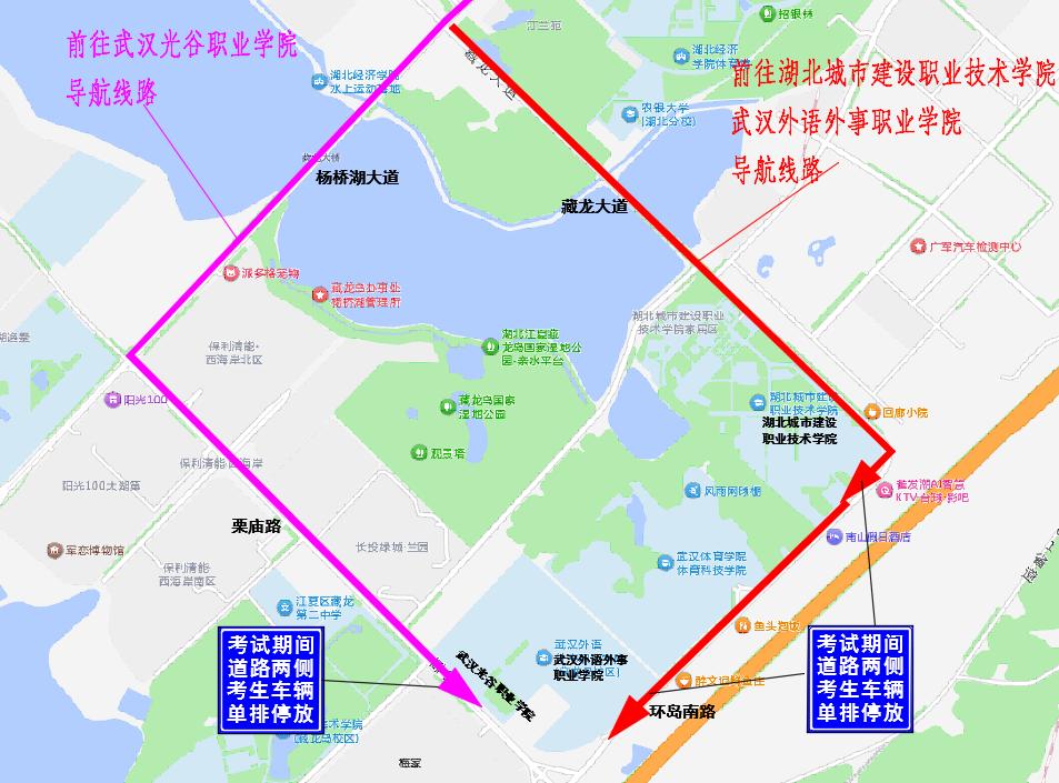 武汉光谷职业学院:光谷方向考生车辆行驶至杨桥湖大道→栗庙路,在栗庙路小区地下停车场或者龙苑路路口以东道路两侧单排停放车辆。