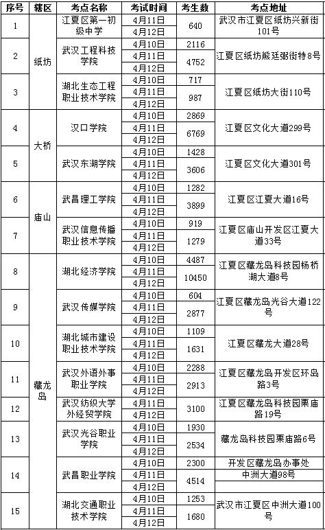 预计考试前后1小时,纸坊大街、谭鑫培路、杨桥湖大道、中洲大道、藏龙大道、栗庙路、文化大道及湖北经济学院、武昌职业学院、光谷职业学院等考点周边道路车辆出行集中,建议考生优先选择公共交通出行,以免堵在路上耽误行程;自驾前往的考生,请按照交通指示标识通行,服从现场交警指挥,将车辆规范停放至指定区域,接送考生车辆请即停即走,不要违停造成拥堵。