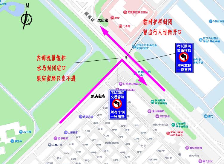 栗庙路栗庙南路路口交通管制(沿线涉及武汉纺织大学外经贸学院、武汉外语外事职业学院、武汉光谷职业学院):交管部门将根据交通流量情况,采取临时交通管制措施;