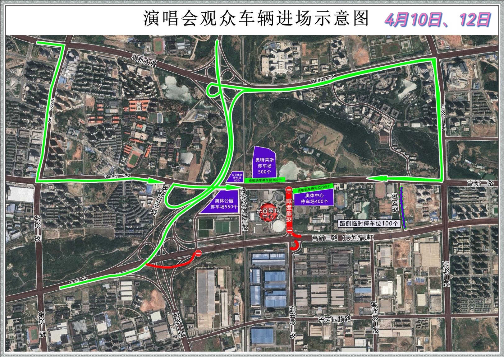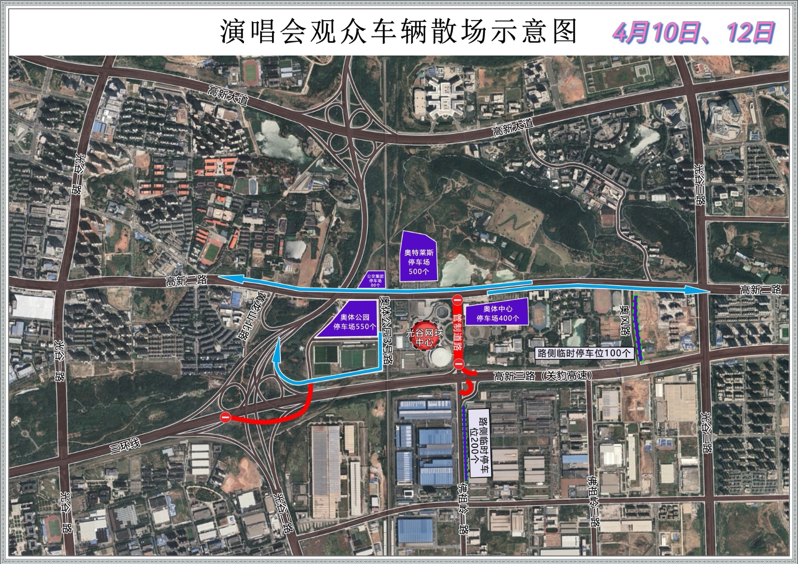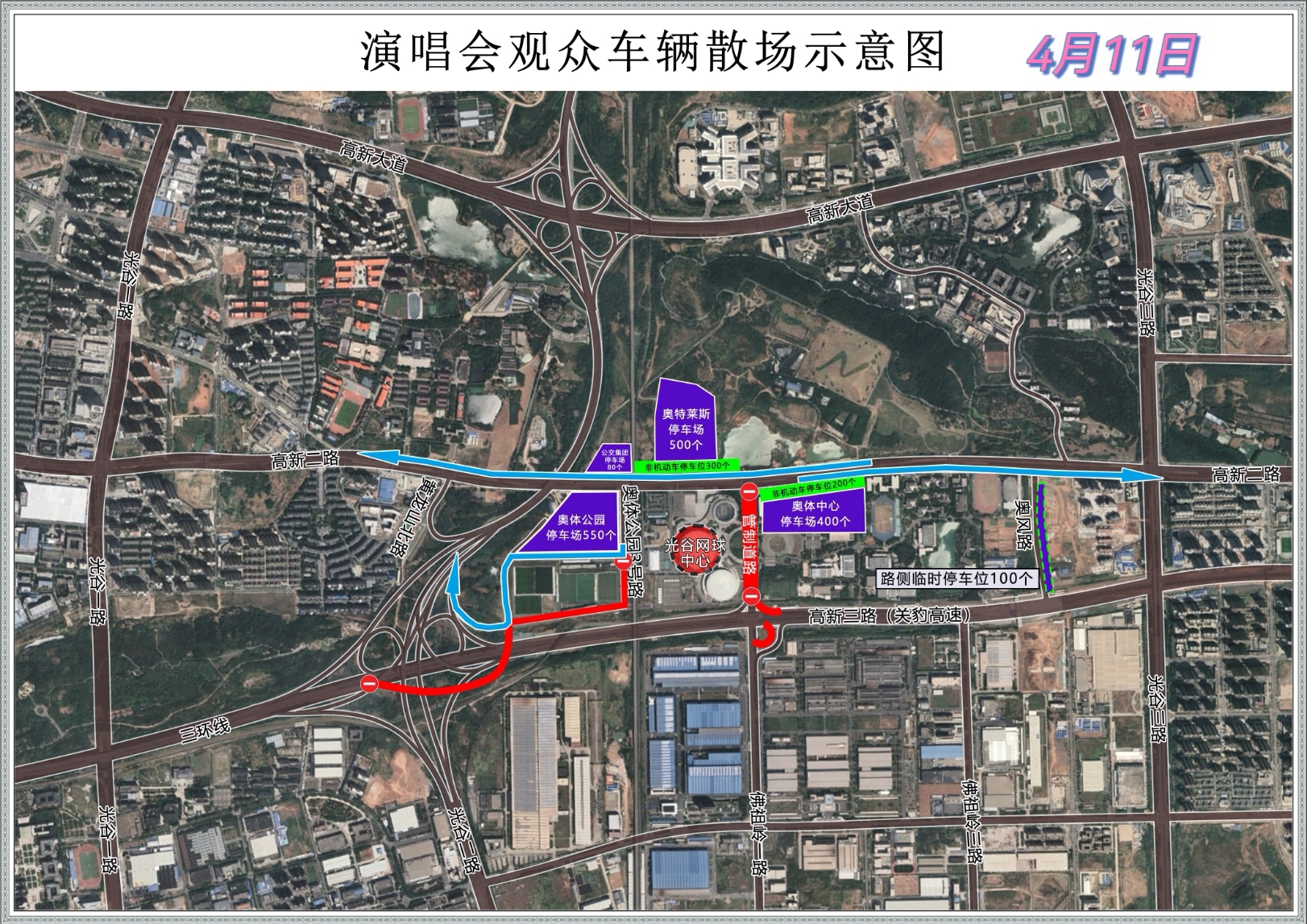 散场时,奥体公园三号路、奥体公园二号路实行单向通行,奥体公园路停车场出场车辆一律由奥体公园二号路、奥体公园一号路驶入三环线。高新二路西向东车辆由光谷三路上高新大道,东向西车辆由光谷一路上高新大道。