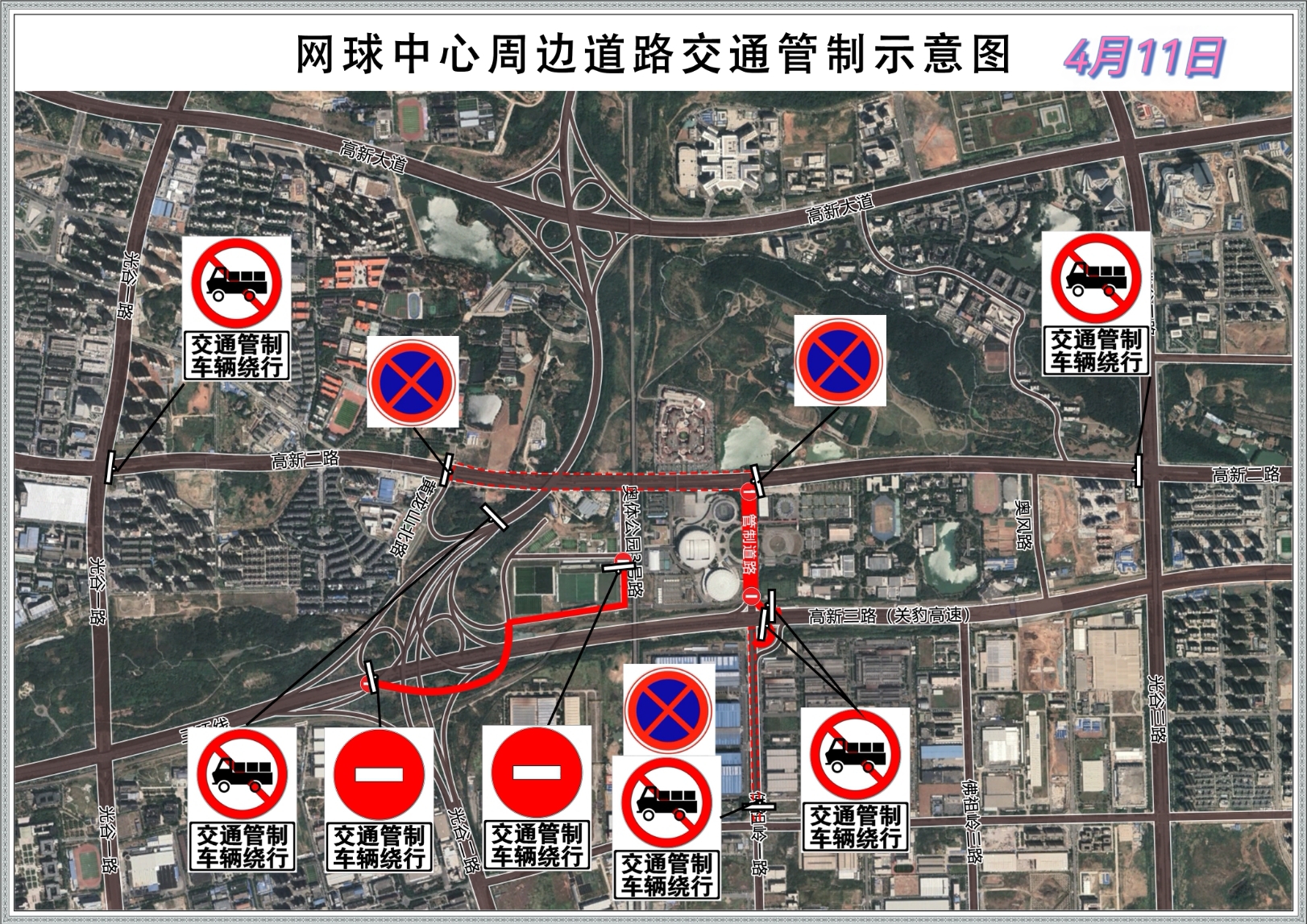 此外,高新二路(黄龙山北路至光谷三路)禁止货车通行;关豹高速佛祖岭一路立交往网球中心匝道、三环线高新二路出口匝道将采取临时交通管控,禁止车辆通行。