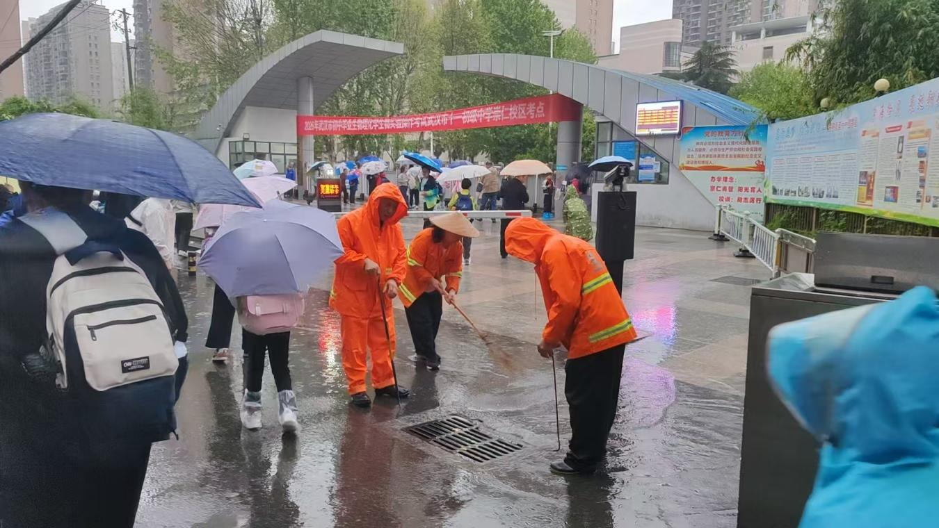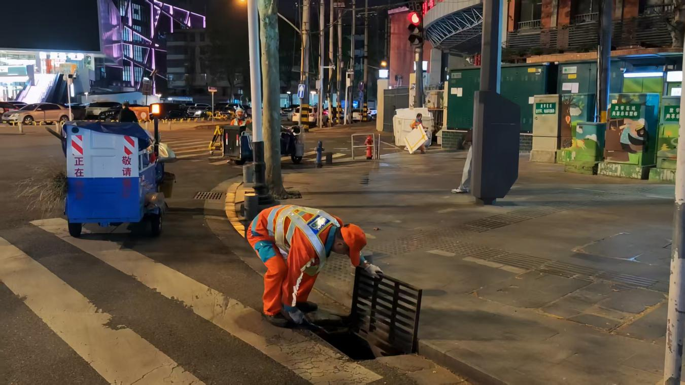 江汉区采取“定点值守+动态巡查”模式,980名环卫工人雨中坚守,对132个短时积水点位实施“人工清掏+机械疏通”快速处置,累计疏通排水口320处。