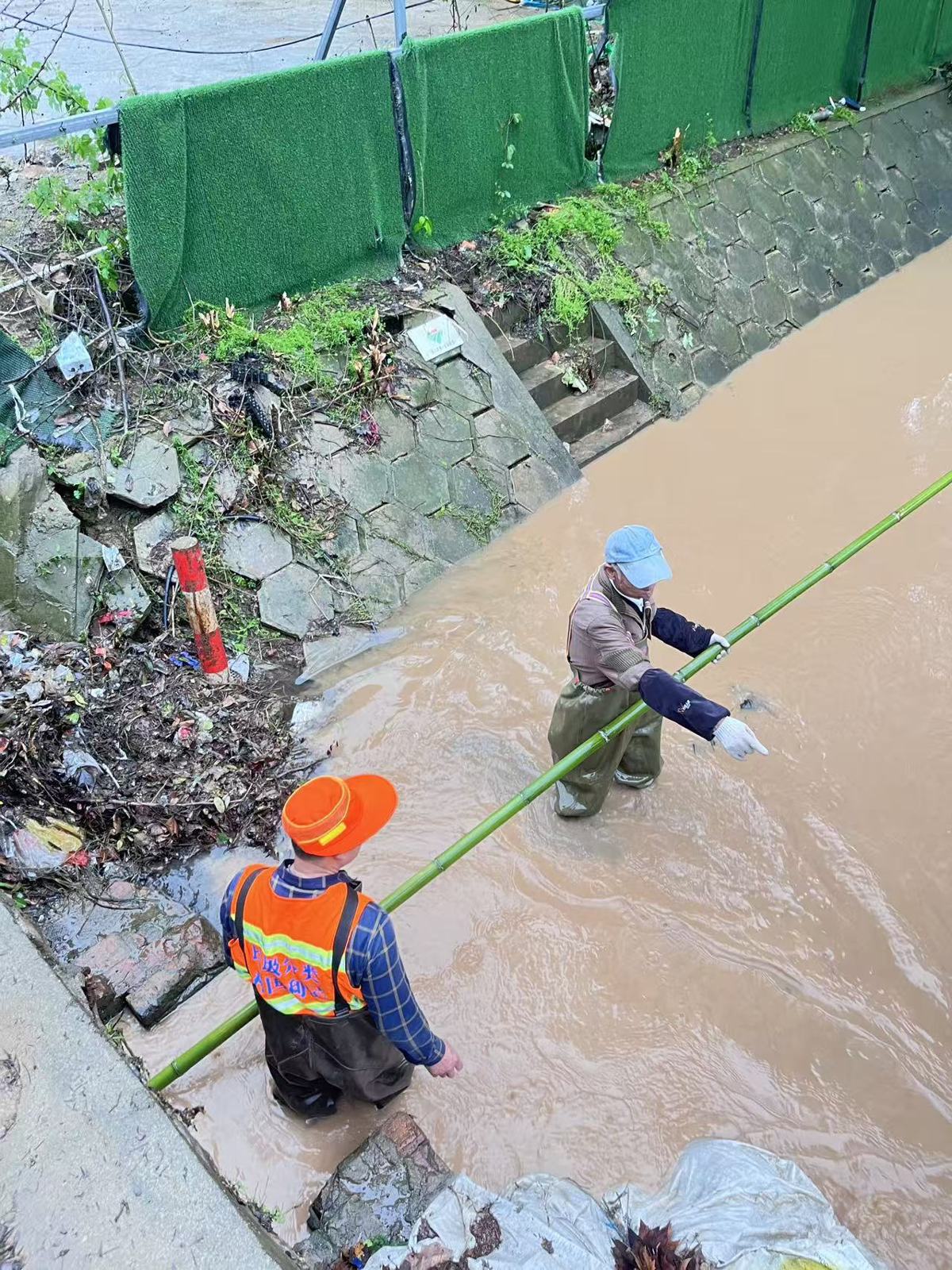 在邓南街道窑头村,强降雨导致新村路旁沟渠的两个涵洞、共4个口子被枯枝杂草严重堵塞,堵水路段长500余米,积水无法顺利排出,存在漫溢至路面的风险。正当村干部组织排查时,窑头村环卫工谭安静恰好路过。为避免造成新村路大面积积水、影响村民和车辆通行,他二话不说,穿上雨衣、拿上竹竿,伸进涵洞口,一把把掏出淤积的断枝、烂叶和淤泥。雨越下越大,泥浆溅了满脸,他始终没有停歇。路过的村民张石良见状,连忙跑回家换上雨衣,返回现场与谭安静并肩作战。两人轮番掏挖、清理杂物,经过近半小时奋战,涵洞终于恢复通畅,积水迅速消退,路面恢复通行。“涵洞通了,路好走了,多亏了他们!”周边村民纷纷点赞。