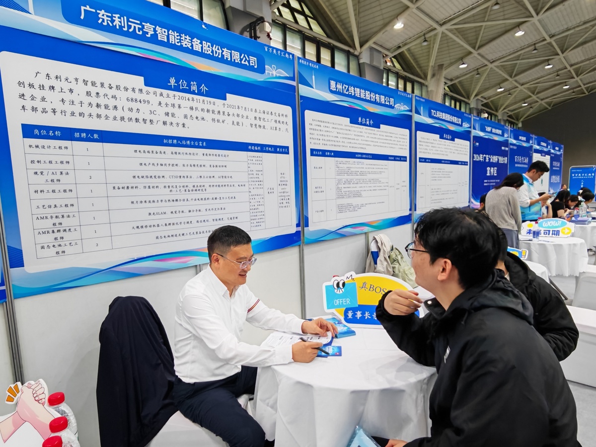 作为新能源装备领域的头部企业,广东利源亨智能装备股份有限公司此次专程赴汉揽才。公司研发负责人杜先生介绍,企业为宁德时代、比亚迪等行业龙头供应核心设备,已在科创板上市,此次带来包括10个博士岗位在内的60多个岗位,“公司层面年薪40万元起,叠加惠州市人才政策后,博士入职首年综合收入可达70万元以上。”杜先生介绍,同时企业还开放本科与硕士岗位,本科起薪8万元至12万元,硕士起薪18万元至25万元。杜先生坦言,武汉高校人才密集、储备充足,是企业重点引才区域,现场已有多位博士求职者深入沟通。