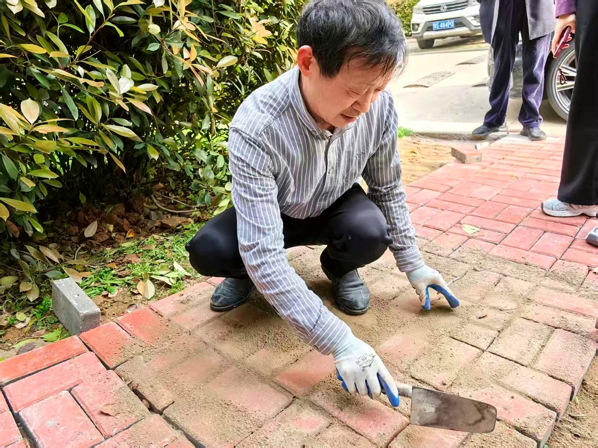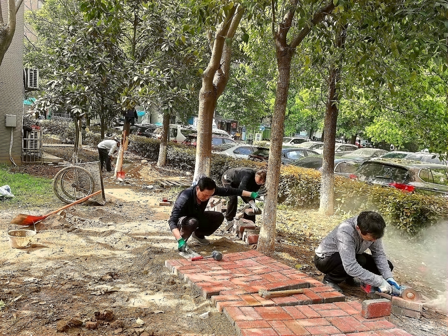 李冬林决定自费采购彩砖、沙土、水泥等物料,还召集来两位会泥瓦工的居民当志愿者,于4月6日开始施工。大家细致地填平低洼路段,尽量铲平坡度大的地方,反复夯实路基土层,将坑洼不平的小道修得平整坚实。总共花费近5000元,这不包括人工。