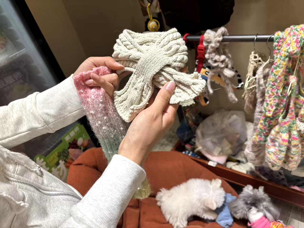 记者发现,货架上还整齐陈列着李韵手工制作的宠物服饰,有软糯的针织围巾、可爱的碎花小裙等,款式多样,都是根据狗狗的体型量身定制,不少宠主看到后都会主动询问购买。