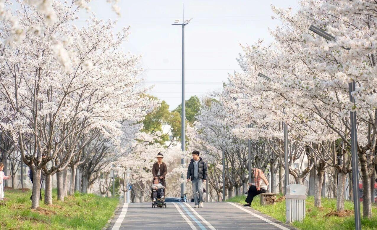 五环体育中心附近的樱花溪公园沿溪蜿蜒近3公里,1700余株、40余种樱花正值盛放,粉白花瓣与清溪相映成趣。公园不定期举办春日民谣音乐会,游客可乘公交H102路至金北一路协和东西湖医院站,步行8分钟即达,或自驾导航“樱花溪公园”。