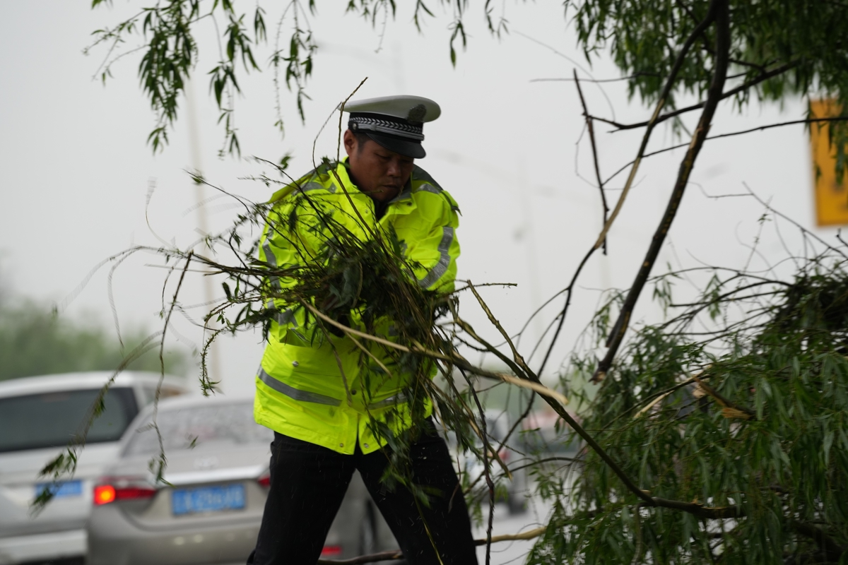 付松立即下车查看,树干直径约有二十厘米,枝叶散落一地,仅凭一人的力量根本拖不动。他和饶耀分工,一人指挥来车减速避让,一人尝试拖拽树枝。手套浸水后打滑,两人直接脱掉手套,徒手抓住树干较细的一端,合力往路边拖。经过近十分钟的反复拖拽,终于把倒树清理到路肩外侧,车道恢复通行。付松的手掌被树枝划了几道口子,简单冲洗后继续巡逻。