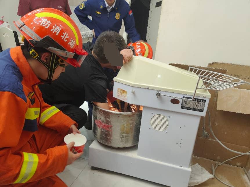 4月5日21时51分,武汉市江汉区民主一街一居民楼内,一名男子在操作和面机时右手不慎卷入机器,其家属发现后立刻拨打了报警求救电话。武汉市消防救援指挥中心迅速调派江汉路消防救援站7名消防员赶赴现场救援。