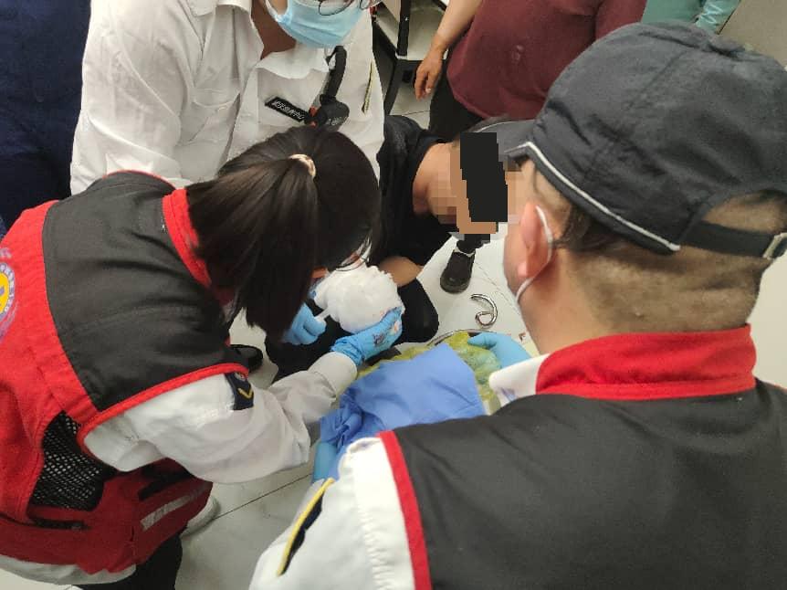 随后,现场等候的医护人员立即对伤口进行了紧急处理,并将男子送往医院接受进一步救治。