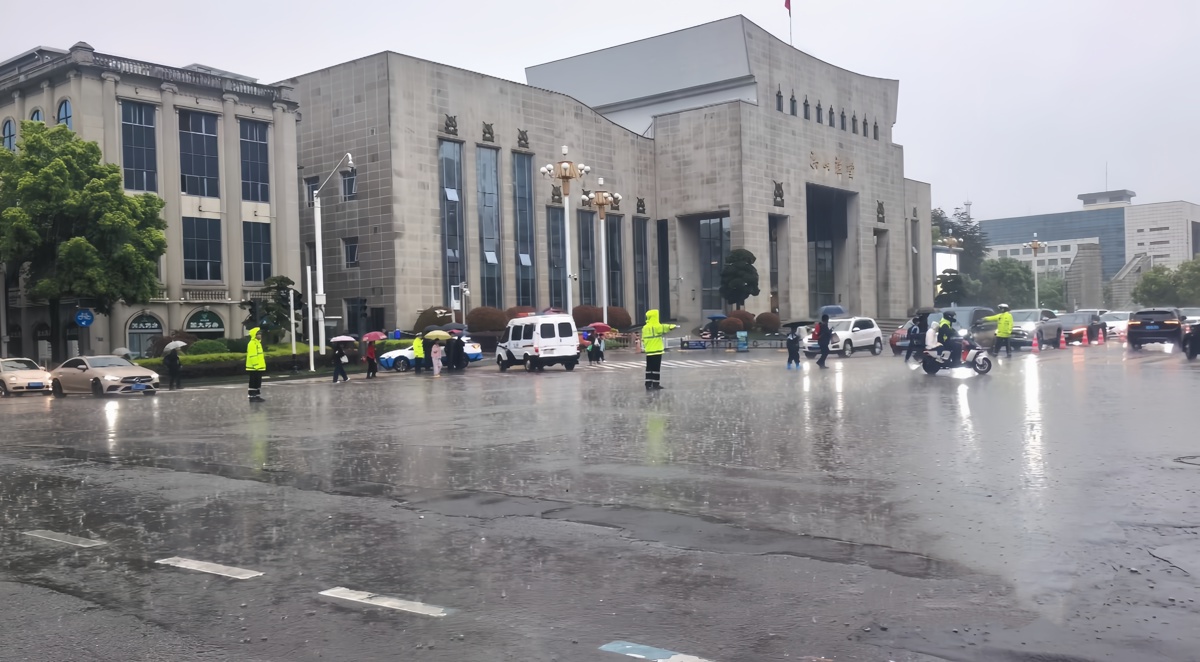 8时许,洪山礼堂十字路口因暴雨导致红绿灯“罢工”,过往车辆、行人陷入混乱,极易引发交通事故。执勤民警辅警快速联系相关单位开展抢修,同时站在路口中央,挥舞手臂、吹响口哨,在倾盆大雨中化身“流动信号灯”,指挥车辆分流、行人通行。
