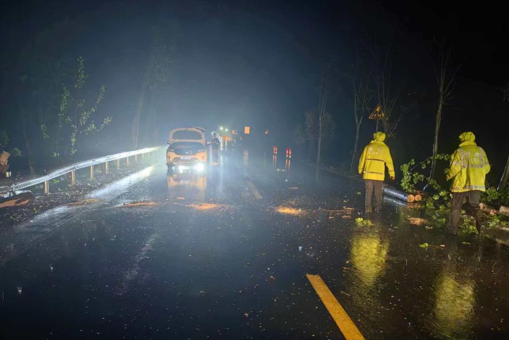 ▲高警三支队民警在许广高速联合养护部门排查、处置路边树木倒伏隐患。