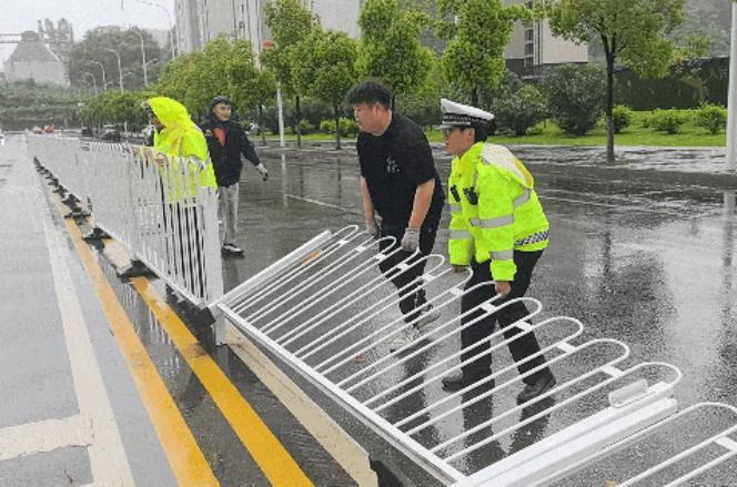 ▲黄石交警迅速组织警力,在大雨中将倾倒的护栏扶起归位,及时消除安全隐患。