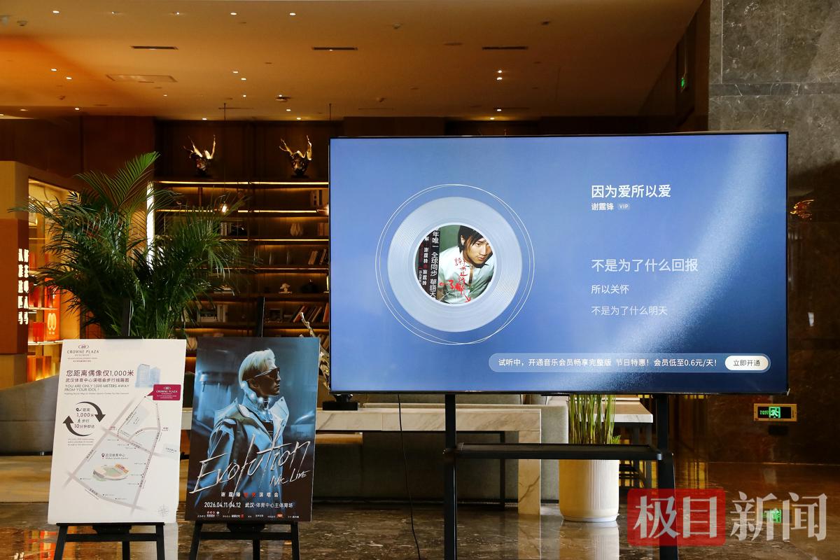 “因为爱所以爱,温柔经不起安排,愉快那么快,不要等到互相伤害……”记者刚走进武汉保和皇冠假日酒店,谢霆锋熟悉的经典歌曲响起。酒店工作人员介绍,为了给入住歌迷良好的体验,酒店大堂电视循环播放谢霆锋的歌曲,该酒店毗邻武汉体育中心,从酒店到武汉体育中心步行10分钟直达,十分方便歌迷前往观看演唱会。