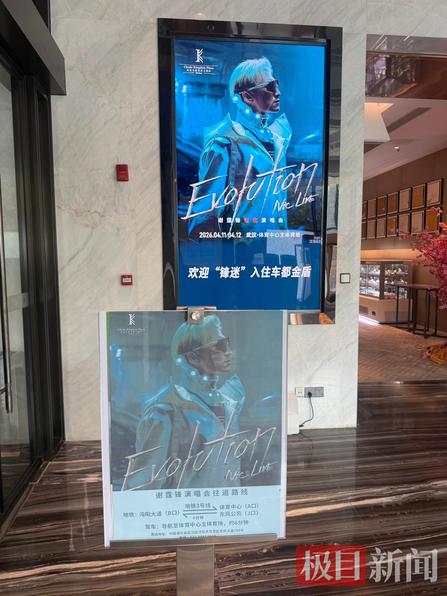 在武汉车都金盾大酒店,酒店大堂摆放着谢霆锋演唱会交通指引展架,展架上详细写了乘坐地铁、自驾的路线,为歌迷观看演唱会提供参考。工作人员介绍,当有谢霆锋歌迷办理入住时,会赠送含有谢霆锋周边的贴纸。同时,入住该酒店的谢霆锋歌迷可享受自助晚餐99.9元/人的优惠,以及延迟退房到下午3点。该酒店相关负责人告诉新闻记者,在谢霆锋演唱会带动下,入住率较平常提高了50%左右。