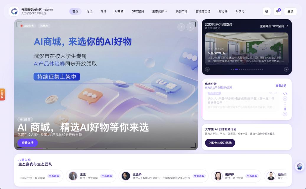 开放社区由武汉市科技创新局指导、武汉投控集团支持,武汉武创通科技服务有限公司联合开源聚变人工智能研究院共同打造,集社群交流、产品展示、人才服务、工具集成、政策推送、场景匹配于一体,设有交流论坛、AI商城、智能体工坊、AI学习等七大板块。