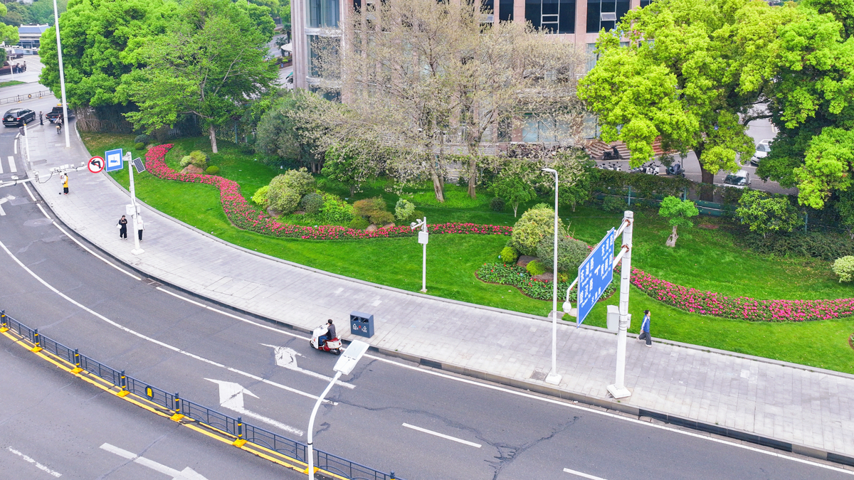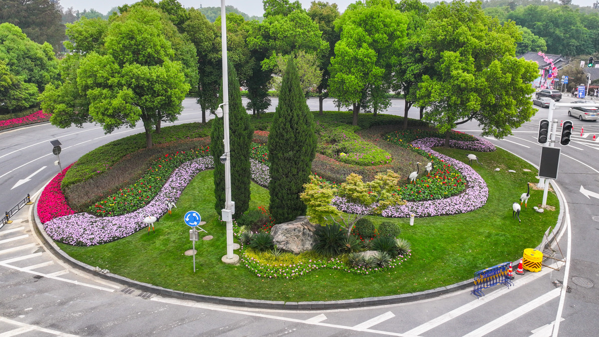 梨园转盘以花带串联起多色花卉,从高空俯瞰,整个环岛以流线型花带为骨架,红、粉、玫等多色花卉沿环岛蜿蜒铺展,如彩色丝带环绕圆心;中心区域以挺拔的常绿松柏为视觉焦点,搭配景观石、葱郁乔木与时令花卉,形成“远看有层次、近看有细节”的立体视觉效果。