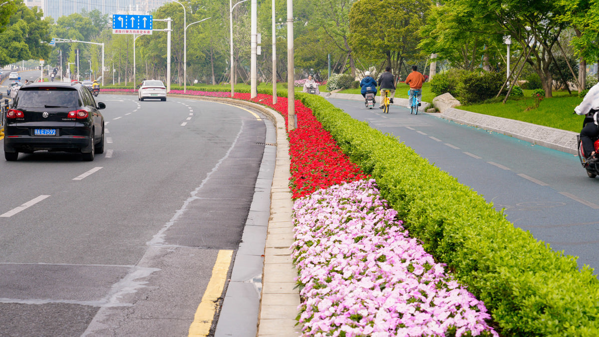在临江大道万达游园,连片的角堇经雨水浸润,花色愈发浓艳,如粉紫色绒毯铺展在绿地之上,搭配造型灌木与艺术雕塑,让临江步道变身诗意花园;天鹅路沿线,红、粉、紫交织的超级凤仙花带沿道路延伸,杜鹃、喷雪花等花卉在雨后吐露芬芳,骑行市民穿梭其间,通勤之路变身赏景之旅。