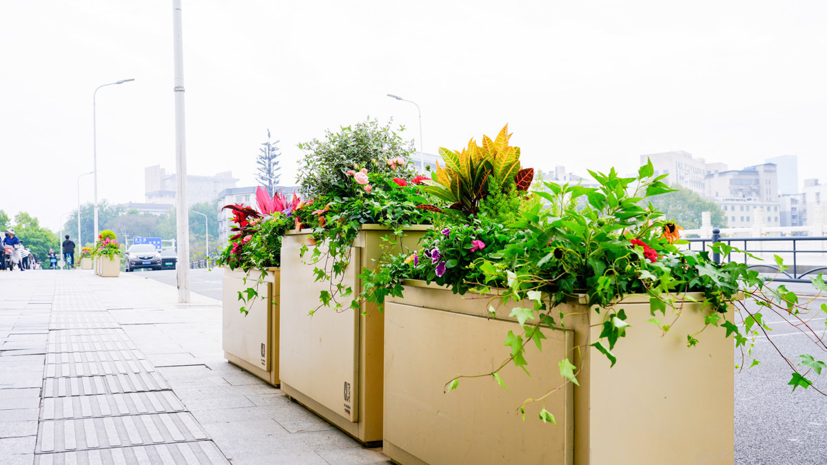 双湖桥的精品花箱内,变叶木、月季、天竺葵等绿植错落搭配,叶片翠绿、花色明艳,为桥梁增添了柔意与生机,让“桥在花中过,人在画中游”成为市民能够切实感受到的日常景象。