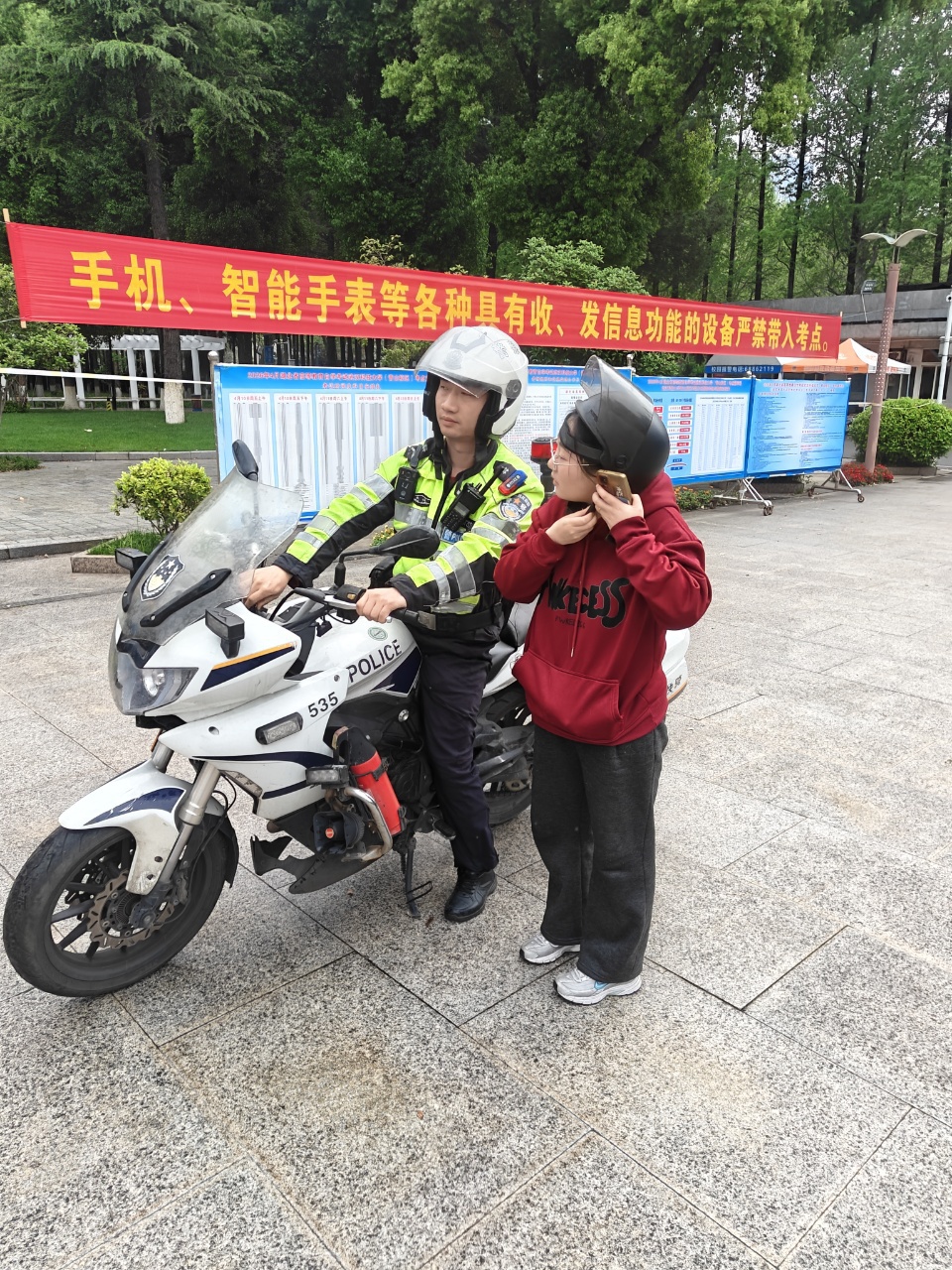 时间紧迫,情况紧急!正在考点指挥室值守的民警杨怡接到消息后,迅速通过电台调度机动队快骑金亮、一中队快骑张晟林驾驶警用摩托车前往支援。两名快骑队员,让考生佩戴好安全头盔后,快速向武汉科技大学青山校区驶去。