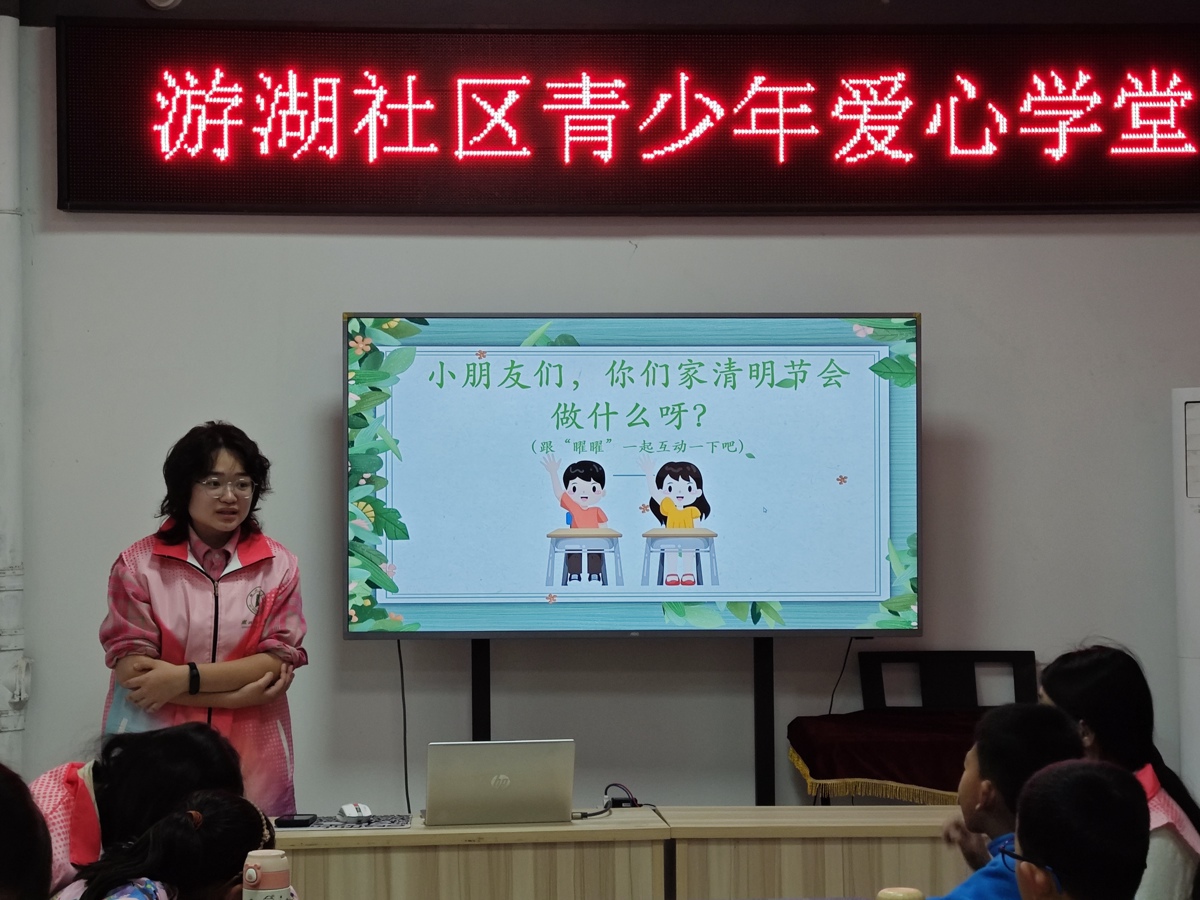 为传承中华优秀传统文化,让青少年深入了解清明习俗、感悟传统节日内涵,4月11日,武汉长江新区游湖社区联合湖北大学知行学院经济与管理学院,开展E-sTeen人生“CEO”童训项目,爱心学堂春季第四课。本次课程以“风清祀远,雨润春生”为主题,通过趣味互动、AI问答、才艺展示、手工实践等形式,让孩子们在轻松欢乐的氛围中走近清明、读懂传统,让文化根脉在童心间扎根生长。