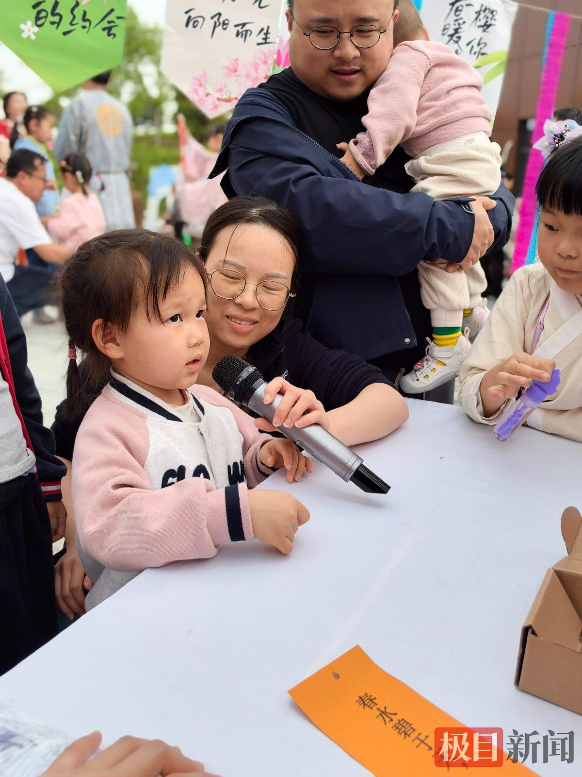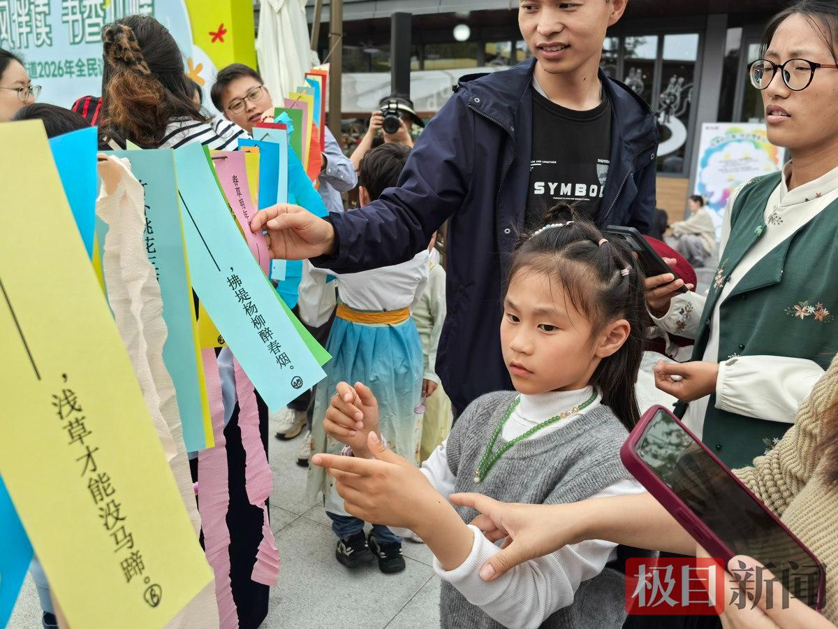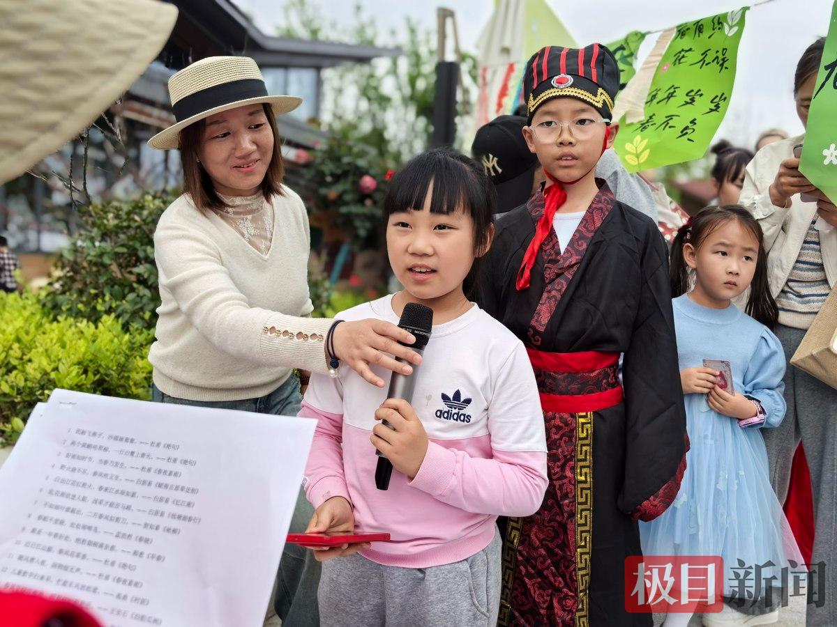 不过,小摊主们也有“分心”的时候,因为他们想去参加整场活动中最热闹的“春日赛诗会”环节。按照主持人的指引,他们纷纷到主广场右侧的“晒诗绳”上寻找题目卡片,家长帮忙用手机拍下卡片上的半句诗内容。然后他们一起跑到另一侧的“背诗台”前排起长长的队伍,孩子按先后顺序拿起麦克风,迫不及待展示自己的文学阅读积累。