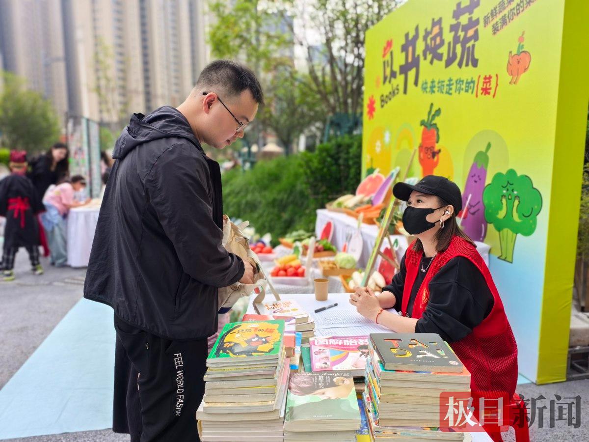 入口处的签到处前,藤编篮里的番茄、黄瓜等新鲜蔬菜整齐摆放,迎接亲子家庭带着闲置书籍前来“以书换蔬”。孩子踮着脚尖,小心翼翼地将书籍递给工作人员,眼神里满是期待。居民费先生捐完几本儿童书后,他的孩子马上去挑了自己喜欢的番茄。他说,家里有些看完的书,闲着不如分享出去,这样会产生价值。