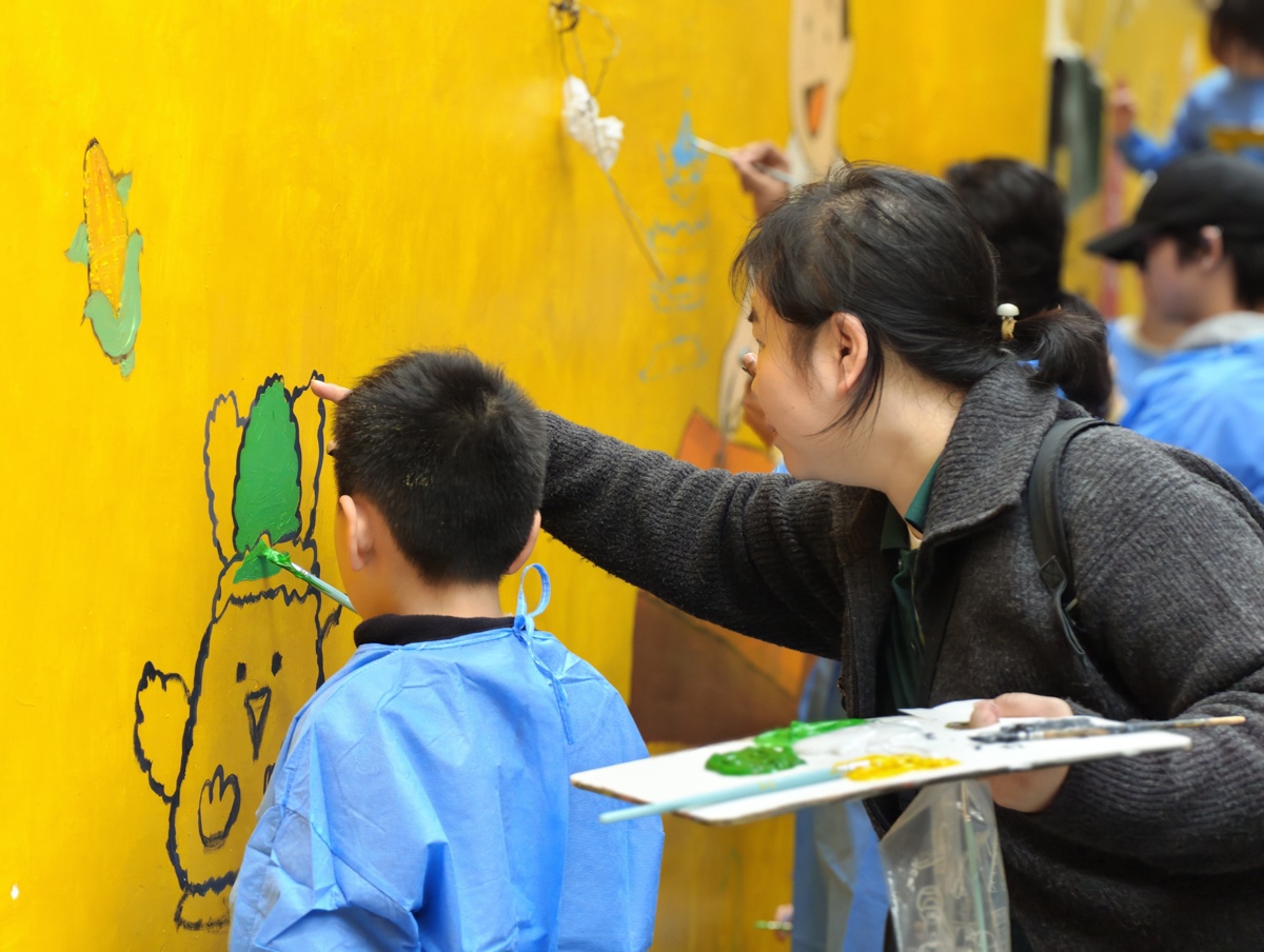 活动现场,来自武汉大学国际教育学院的留学生、武汉学院的大学生,与社区“小雏鹰”青少年们各司其职、默契配合。画笔起落间,线条流畅,色彩铺陈,原本灰暗的墙面逐渐被鲜活的画面填满。