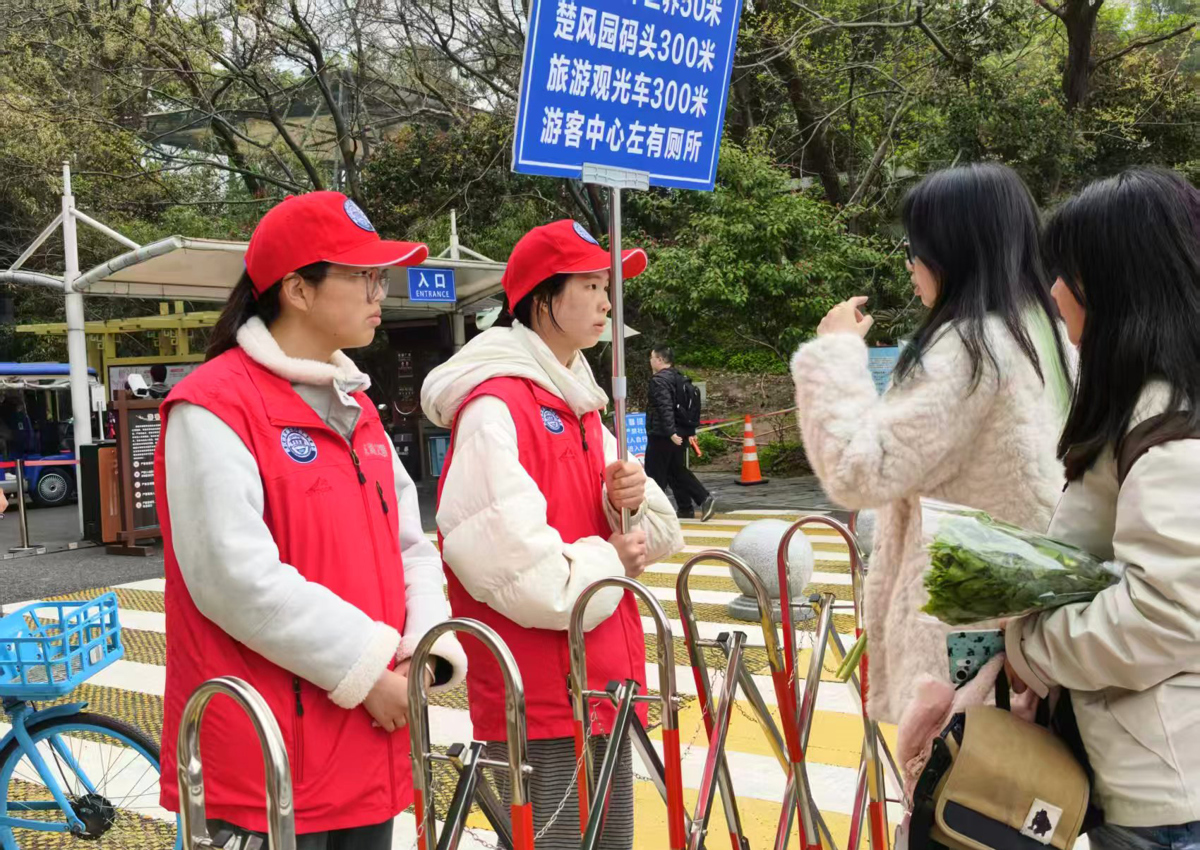 每天清晨,3名党员先锋队员和30名高校义警准时到岗。磨山交通岗、梨园交通岗、樱花园勤务岗,每岗11人,24天累计值守792人次。梨园和磨山交通岗每天引导车流超过5万辆,服务游客10万余人次。在梨园广场、樱花园入口、磨山栈道等易拥堵处,义警们通过引导分流、单向通行,让高峰时段的景区秩序井然。