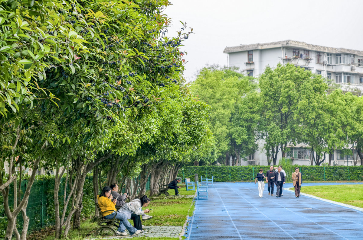 “看着像蓝莓,味道会不会很甜?能不能吃?”正在操场散步的两位女士对果实充满好奇,不仅驻足拍照,还通过智能工具查询食用方法。