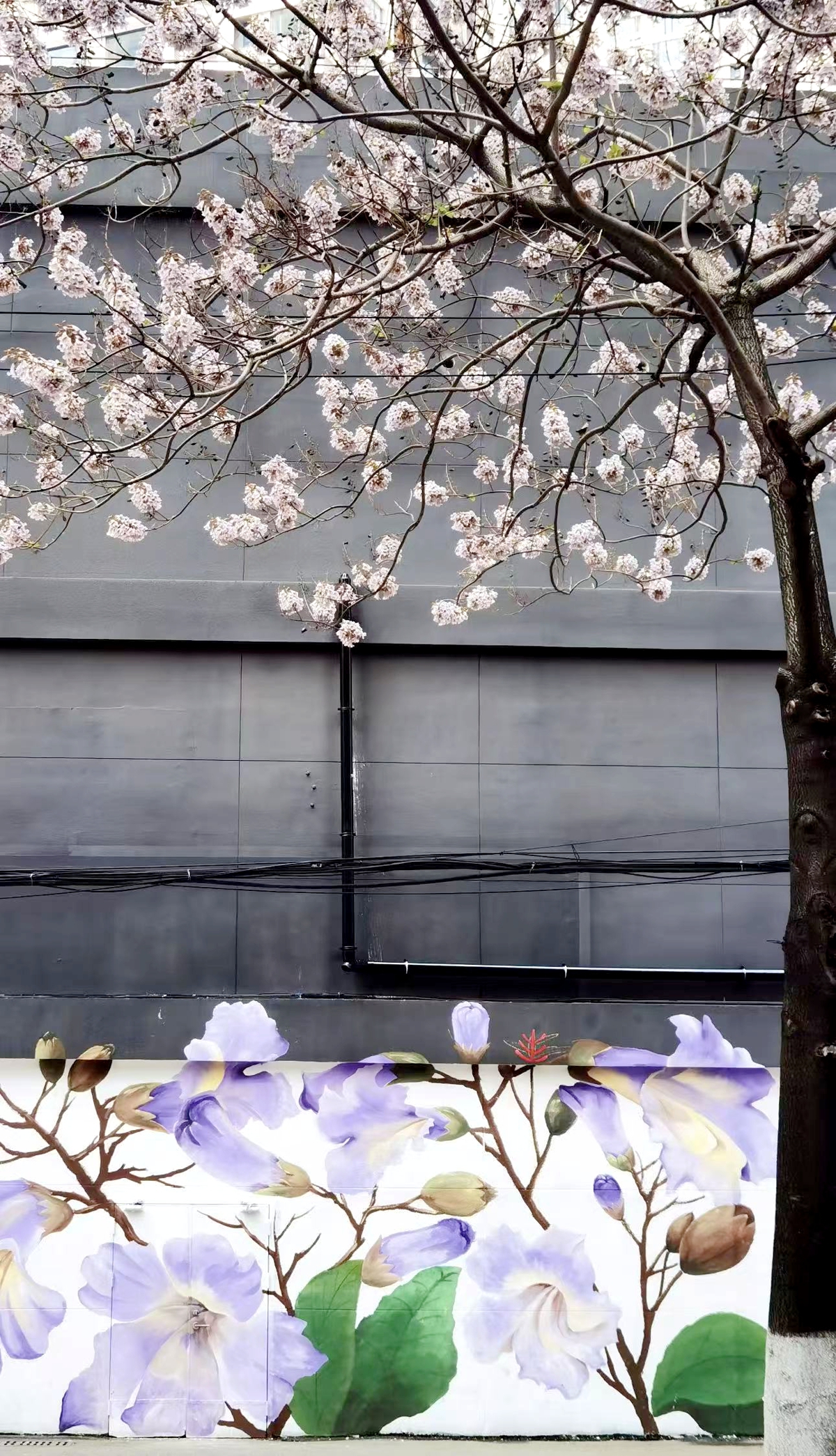 今年,社区进一步推进东一巷微更新,在八古墩东一巷入口处的中百仓储外墙上,绘制了一幅23米长的泡桐花手绘墙画。画师们将枝头盛放的泡桐花“搬”到墙上,真实的花道与墙上的画作相映成趣,成为新的打卡点,也让这条老巷子更具文化气息。