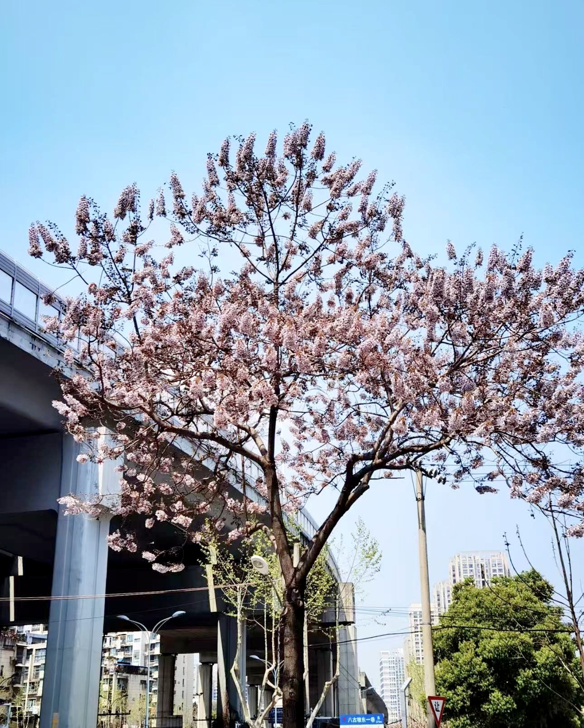 据了解,八古墩东一巷与福利路,是全武汉仅有的以泡桐为行道树的两条街道。泡桐作为湖北本土树种,在江汉平原有着悠久种植历史,但多生长于农村,在城区作为行道树并不常见。其中,八古墩东一巷长约200米,78株泡桐树沿街而立,最早一批由武汉市园林局于2007年栽种,部分树龄较小的则是去年修路后新栽;福利路有34株泡桐,种植于21世纪初。每年三月末四月初,两条路的泡桐花隔空呼应,形成百米“紫色隧道”,成为江城独有的春日地标。