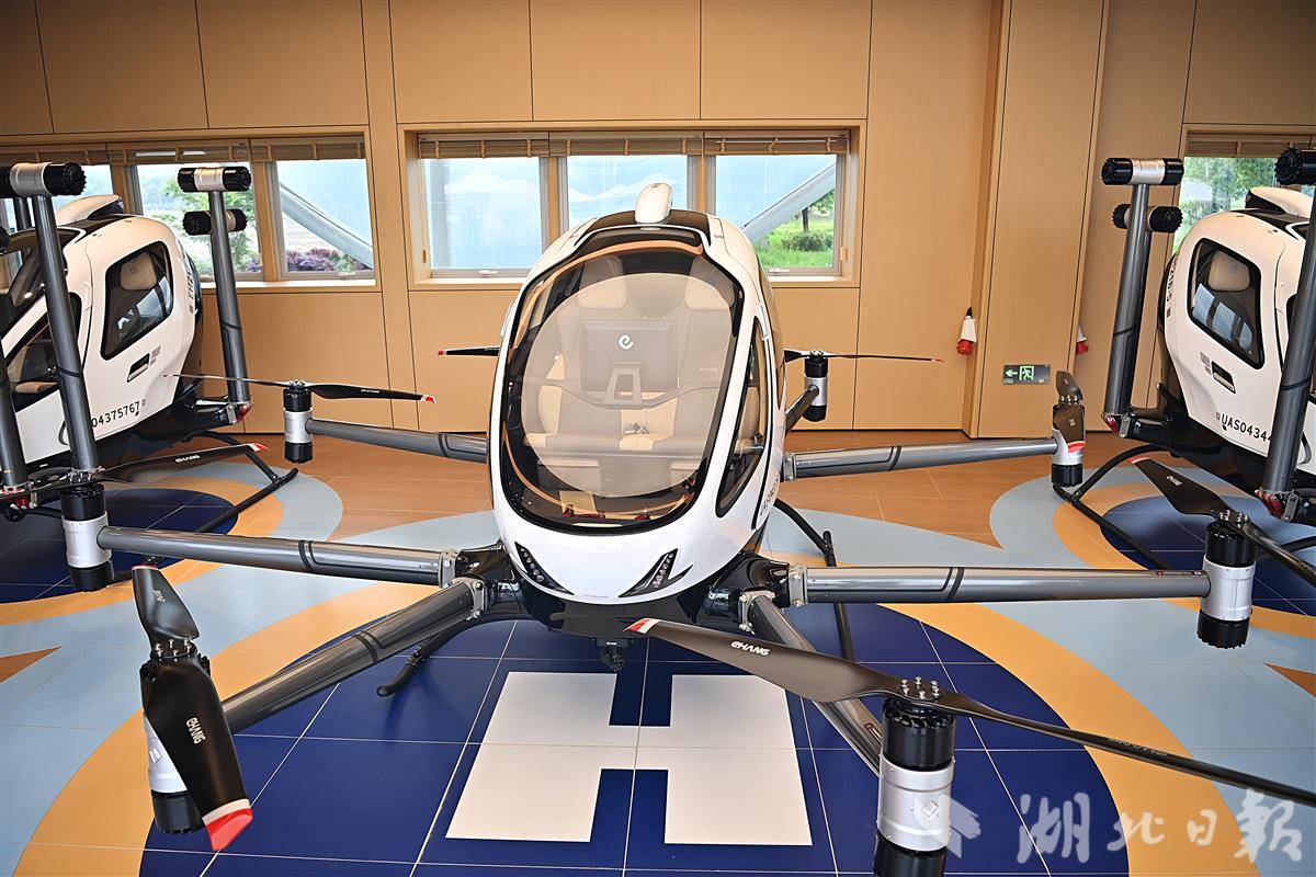 据了解,这3架载人无人机,长6.05米,宽5.73米,高1.93米,由16个螺旋桨组成;为全智能无人驾驶航空器,能够垂直起降,完全不需要跑道,主要在低空空域飞行。通过地面指挥调度系统管理,多架航空器可以在空中完成井然有序的无人驾驶飞行,最大飞行速度可达130公里每小时。(湖北日报全媒记者 朱熙勇 摄)