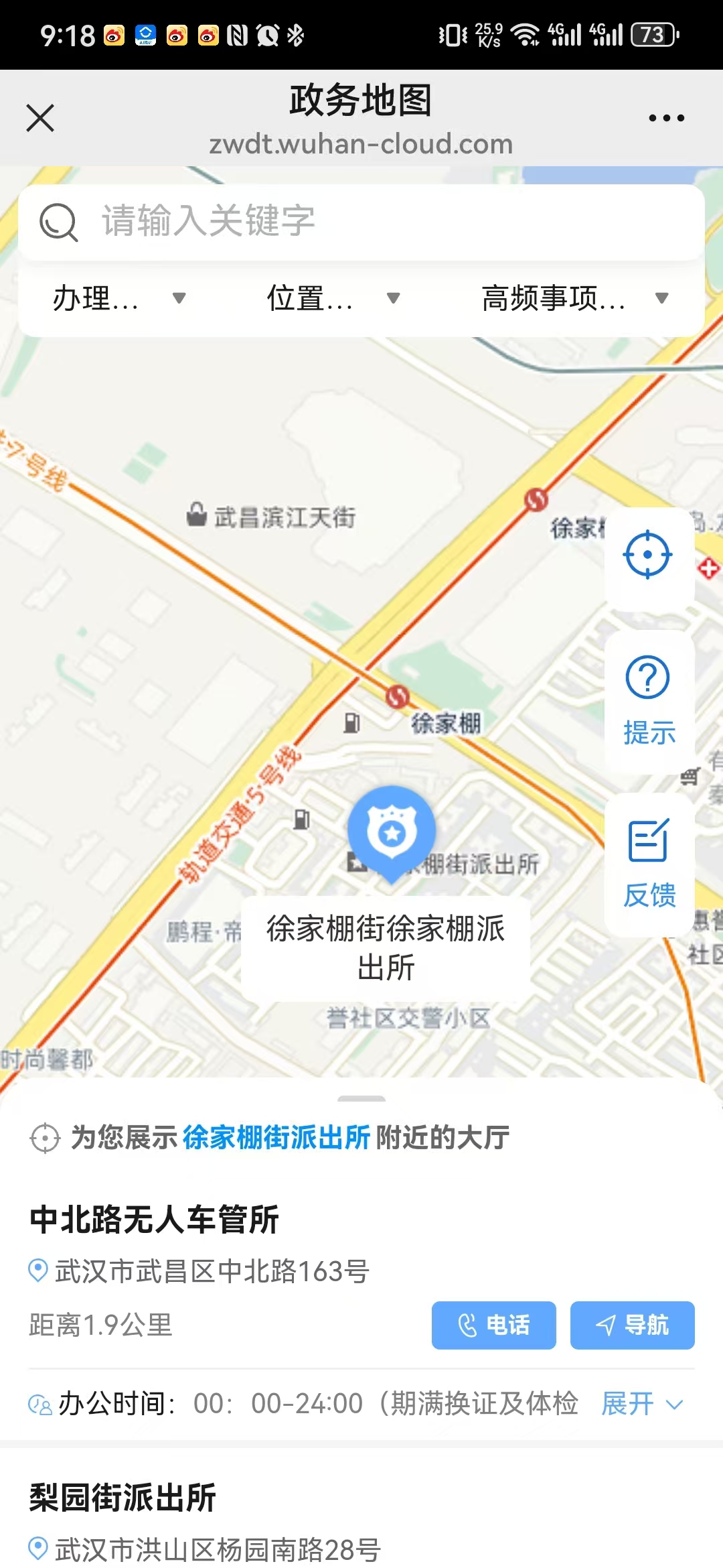 武汉公安“政务地图”,授权定位后,页面自动按距离由近到远显示附近5公里内的所有公安服务网点。