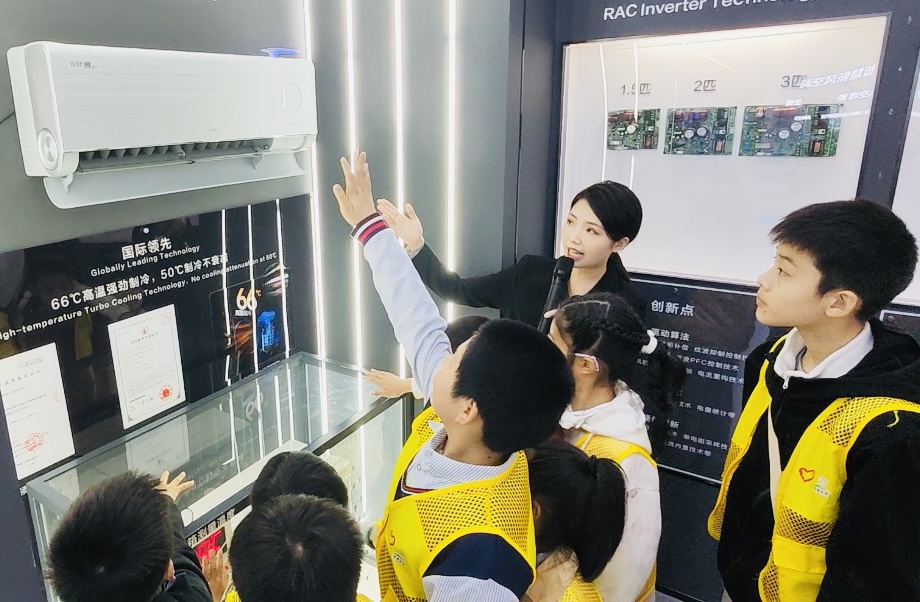 活动的第一站,孩子们在展厅里认识了空调家族的“百变成员”。能兼顾房间制冷、电梯通风的三合一空调,打破了大家对空调使用场景的固有认知;从迷你厨房空调到大型户外外机,不同尺寸的产品让孩子们直观感受到“按需定制”的制造逻辑;而自带“小蓝翼”的智能空调,更是凭借能根据空气质量自动升降的智慧功能,让孩子们连连发出惊叹。
