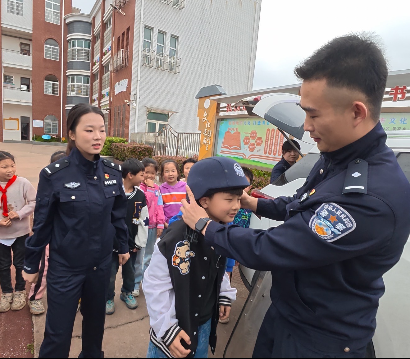 “大家别急,排好队,一个一个来参观。”陈磊一边笑着维持秩序,一边利落地打开警车后备箱,取出车内的出警装备和急救包。他举起一个警用防暴头盔,轻轻戴在旁边一位小男孩头上:“这个头盔作用特别大,能在执行任务时保护我们的头部,大家平时坐在电动车上也要记得保护好自己,戴好头盔——安全,不论什么时候都是第一位的。”