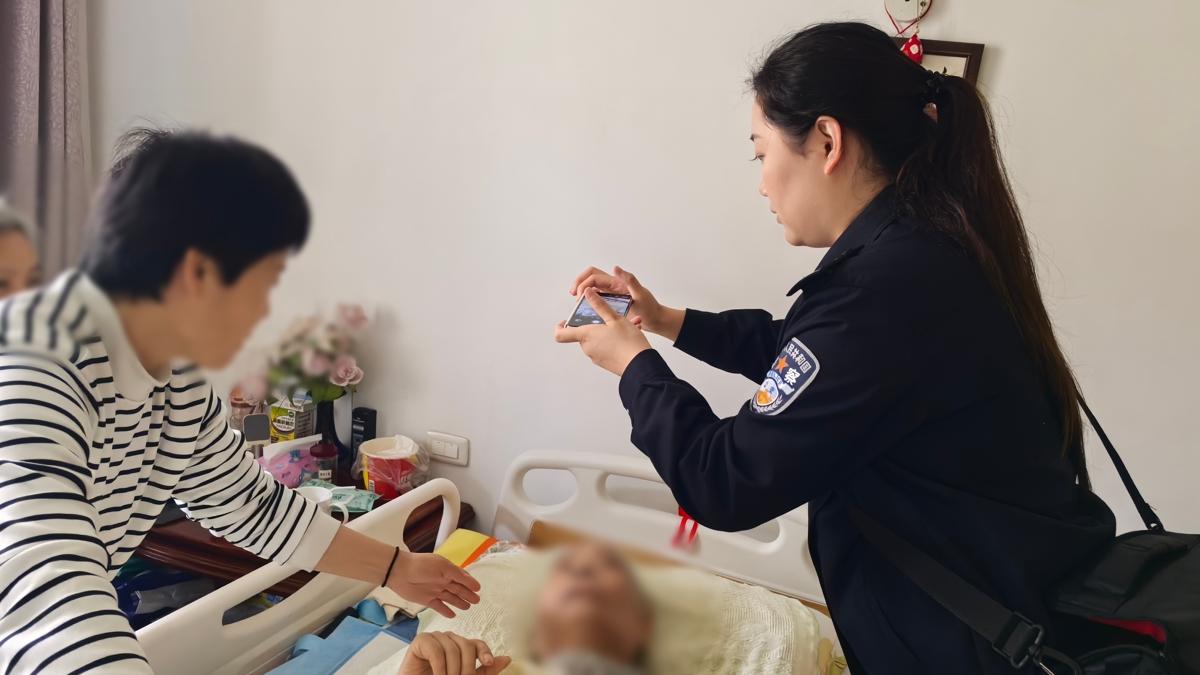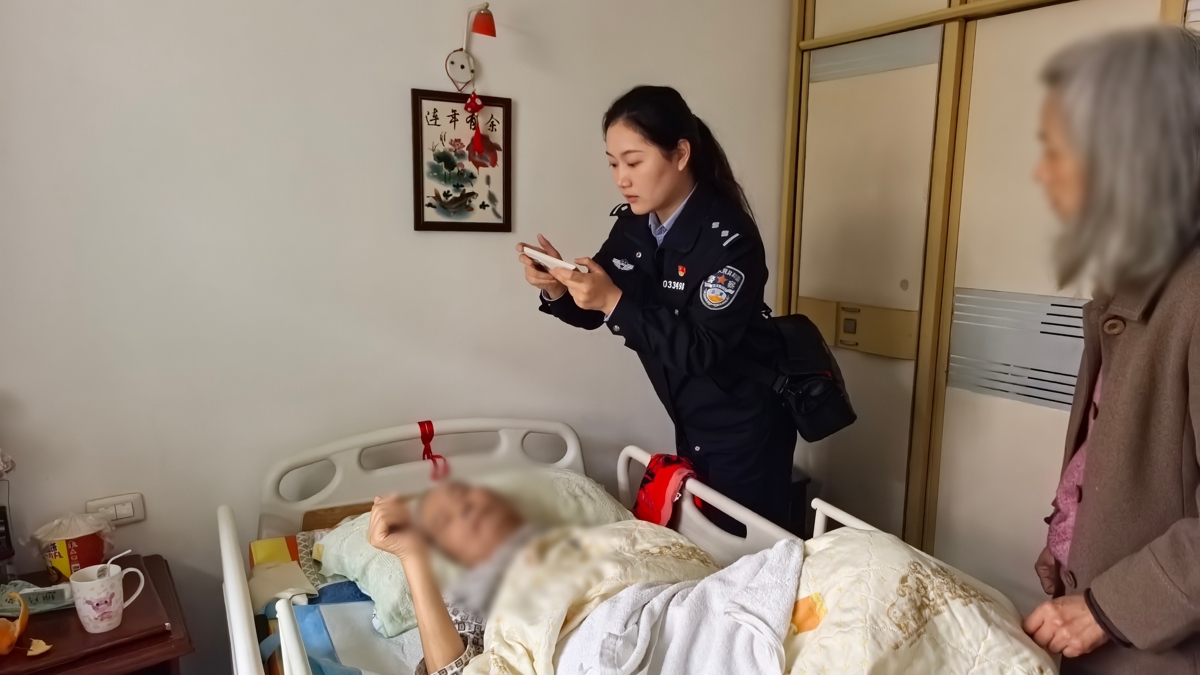 “今天下雨,光线有点暗,您往这边靠一点,几秒就拍好了。”民警在床边细心为蒋女士调整姿势、整理着装,耐心采集指纹和人像信息,很快便完成了办理。