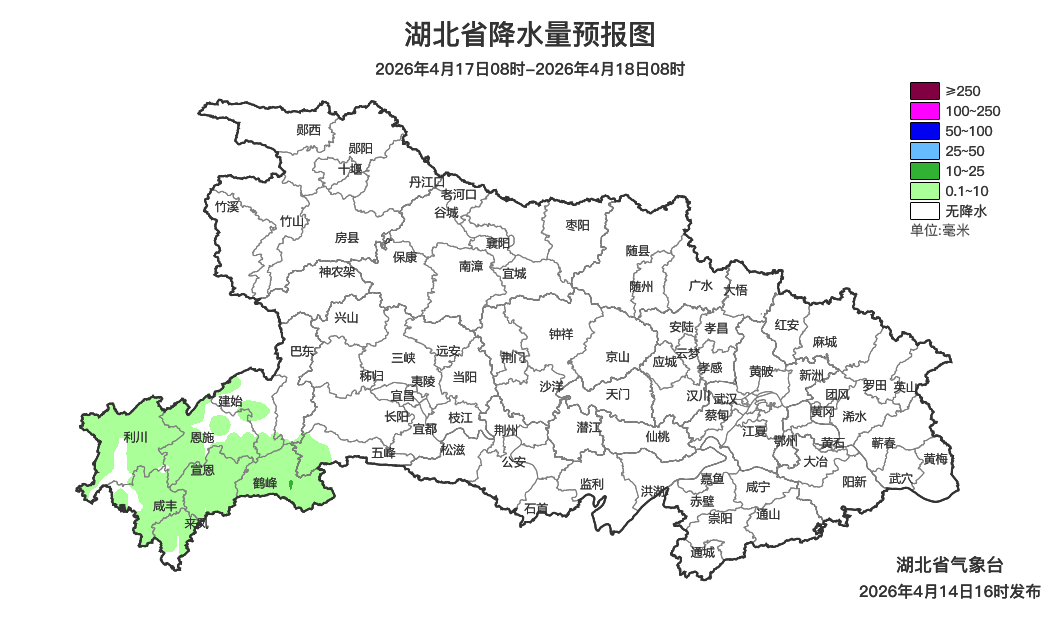 4月17日08时-18日08时,恩施地区短时小雨转多云;其他地区晴到多云。最高气温27~30℃,最低气温西部10~14℃、中东部14~17℃,偏东风2到3级。