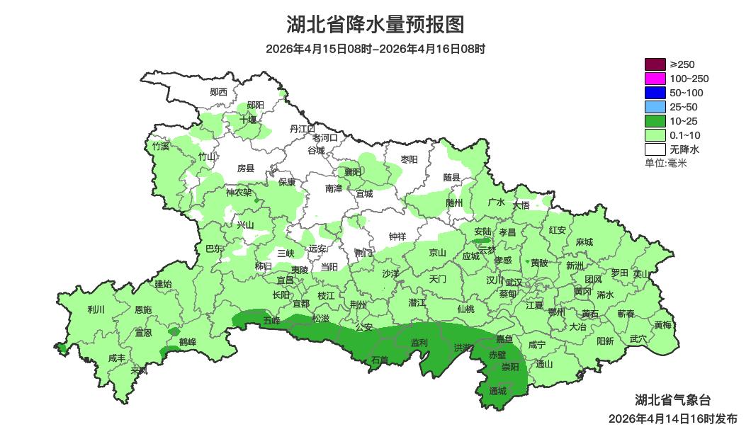 4月15日08时-16日08时,鄂西南南部、江汉平原南部、鄂东南南部阴天有小到中雨;鄂西北多云到阴天,局地有短时小雨;其他地区阴天转小雨。最高气温21~24℃,最低气温15~18℃,偏东风转偏北风2到3级。