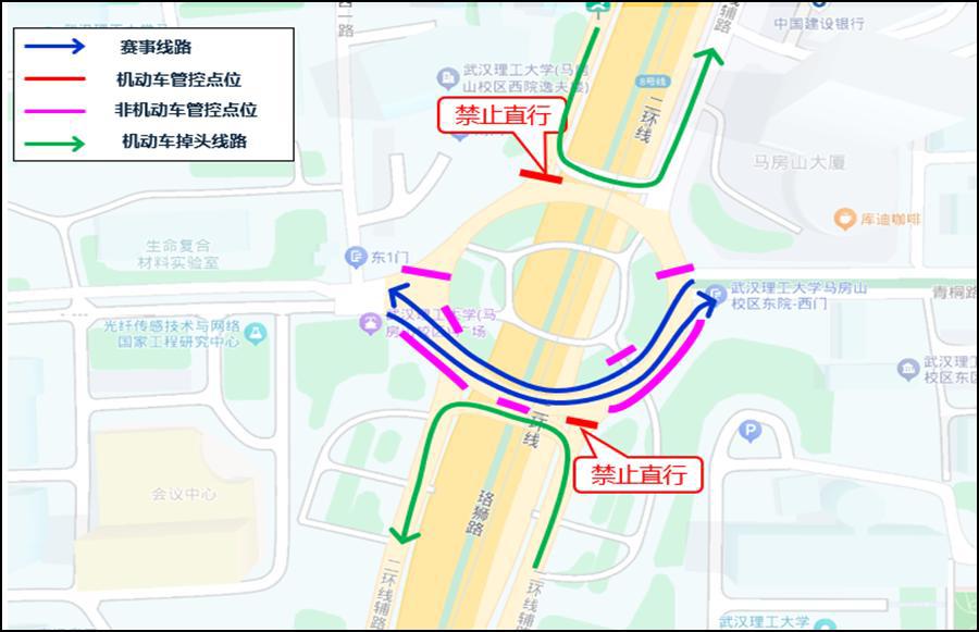1、武汉理工广场环岛区域禁止机动车南北向直行、左转,允许掉头。