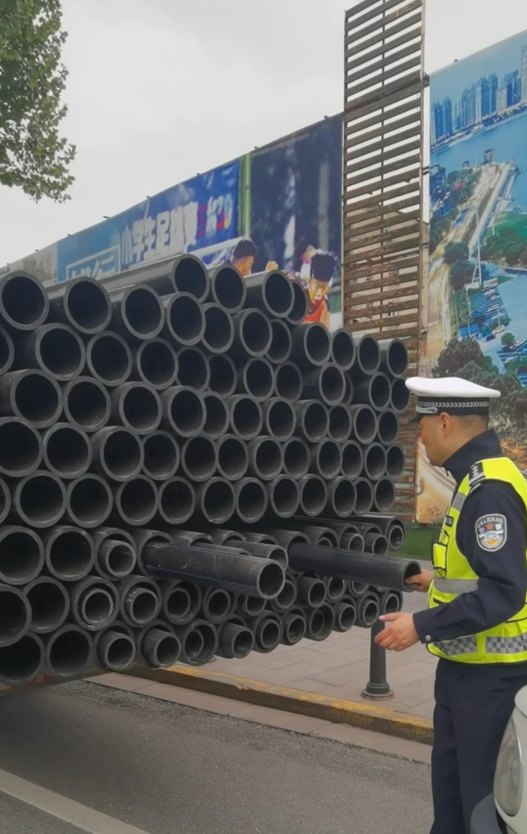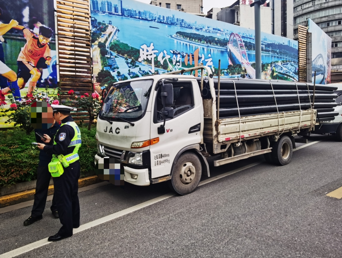 4月15日上午,武汉市硚口区公安分局交管大队民警吴冬兵带领辅警李文刚,在中山大道利济路口拦停一辆违禁通行的货车。车上装满了管材,管材的另一头超出车厢1米多,导致后墙板关不上,驾驶员还不以为然:“这都不重,才一吨多。”