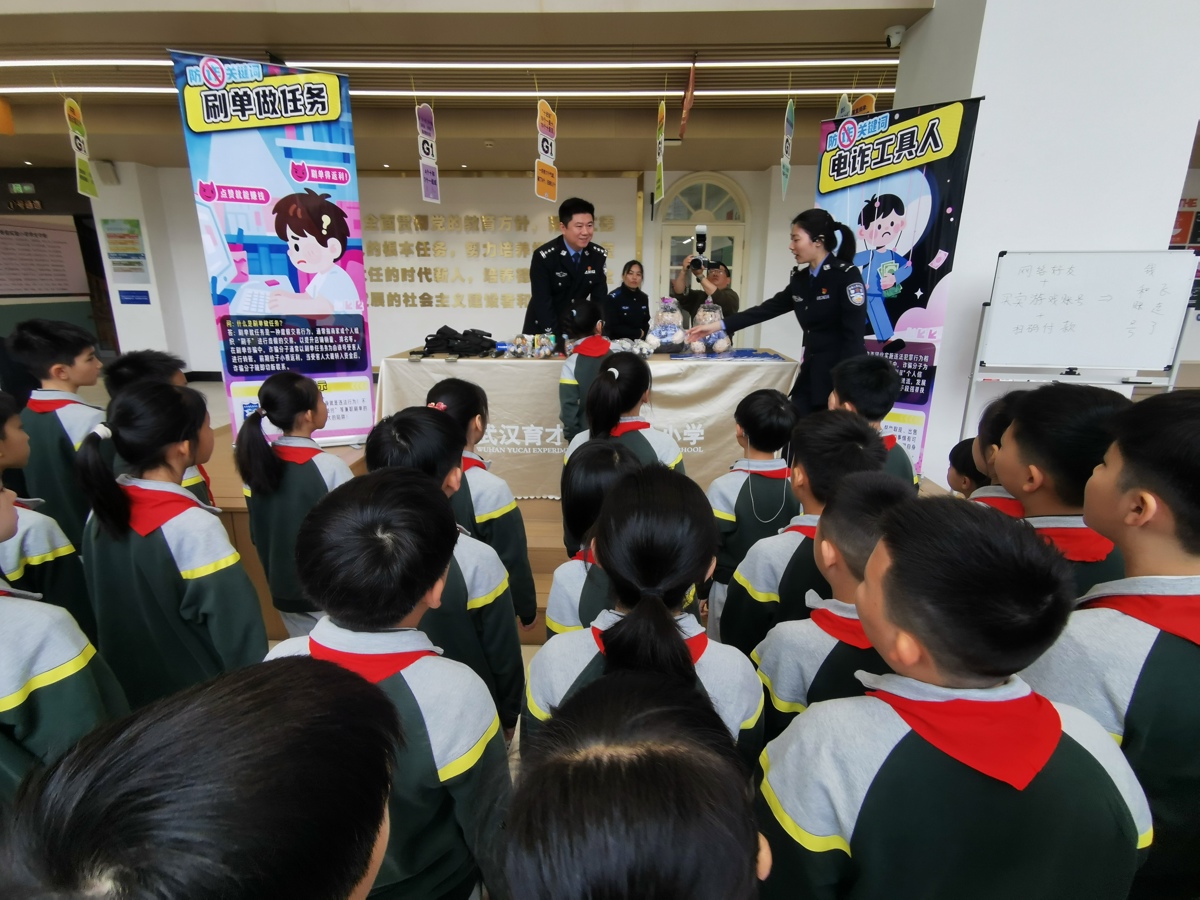 反诈宣讲展台前,武汉市反诈中心民警张皓月,用孩子们熟悉的游戏皮肤、明星应援场景,精准戳穿了骗子的套路。“网络好友+买卖游戏账号+扫码付款,等于什么?”“交钱就能进偶像专属群,是真的吗?”一连串提问,点燃了全场小朋友参与的热情,孩子们争先恐后地举手抢答。张皓月把“不轻信、不透露、不转账、多沟通”的“三不一多反诈原则”编成朗朗上口的顺口溜,微课堂上孩子们许下承诺,立志要当好家庭和班级的“反诈小宣传员”。