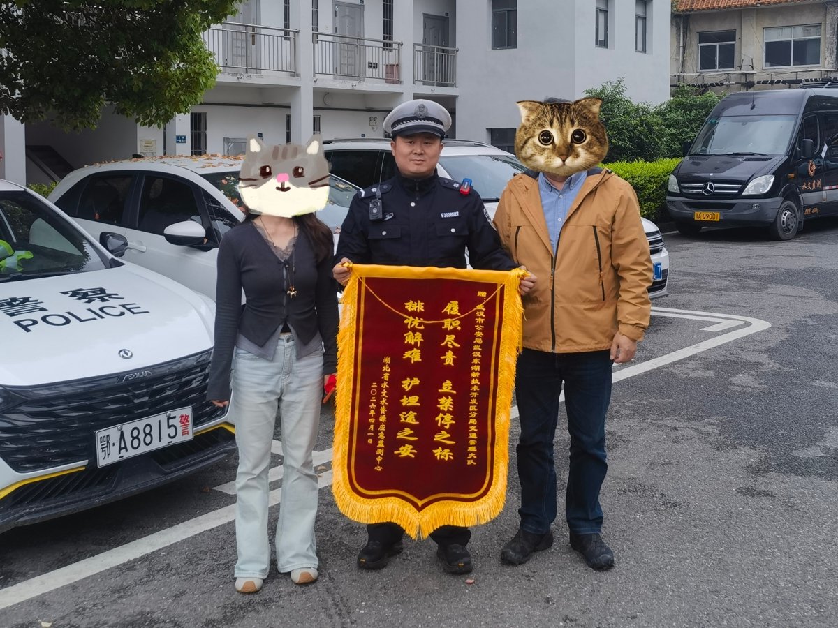 同一天,另一面锦旗被送到了第一警务站。送旗单位是水文水资源应急检测中心,感谢的对象是副站长潘琤和光谷警区警长刘超。